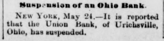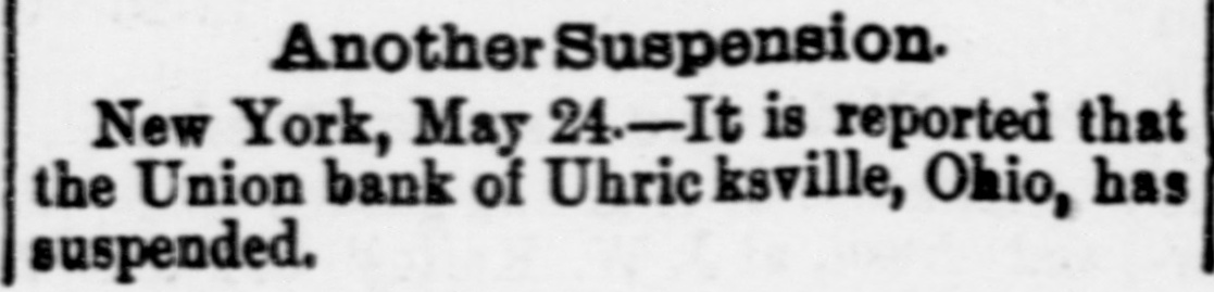 Suspension of an Ohio Bank NEW YORK, May 24.-It is reported that the Union Bank, of Urichsville, Ohio, has suspended.