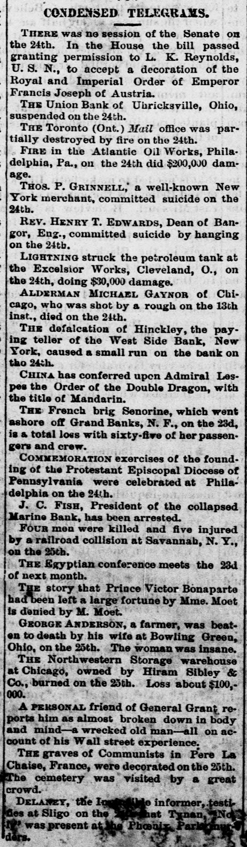 CONDENSED TELEGRAMS. THERE was no session of the Senate on the 24th. In the House the bill passed granting permission to L. K. Reynolds, U.S. N., to accept a decoration of the Royal and Imperial Order of Emperor Francis Joseph of Austria. THE Union Bank of Uhricksville, Ohio, suspended on the 24th. THE Toronto (Ont.) Mail office was partially destroyed by fire on the 24th. FIRE in the Atlantic Oil Works, Philadelphia, Pa., on the 24th did $200,000 damage. THOS. P. GRINNELL, a well-known New York merchant, committed suicide on the 24th. REV. HENRY T. EDWARDS, Dean of Bangor, Eng., committed suicide by hanging on the 24tb. LIGHTNING struck the petroleum tank at the Excelsior Works, Cleveland, o., on the 24th, doing $30,000 damage. ALDERMAN MICHAEL GAYNOR of Chicago, who was shot by a rough on the 13th inst., died on the 24th. THE defalcation of Hinckley, the paying teller of the West Side Bank, New York, caused a small run on the bank on tho 24th. CHINA has conferred upon Admiral Lespes the Order of the Double Dragon, with the title of Mandarin. THE French brig Senorine, which went ashore off Grand Banks, N. F., on the 23d, is & total loss with sixty-five of her passengers and crew. COMMEMORATION exercises of the founding of the Protestant Episcopal Diocese of Pennsylvania were celebrated at Philadelphia on the 24th. J. C. FISH, President of the collapsed Marine Bank, has been arrested. FOUR men were killed and five injured by a railroad collision at Savannab, N. Y., on the 25th. THE Egyptian conference meets the 23d of next month. THE story that Prince Victor Bonaparte had been left a large fortune by Mme. Moet is denied by M. Moet. GEORGE ANDERSON, a farmer, was beaten to death by his wife at Bowling Green, Ohio, on the 25th. The woman was insane. THE Northwestern Storage warehouse at Chicago, owned by Hiram Sibley & Co., burned on the 25th. Loss about $100,000. A PERSONAL friend of General Grant reports him as almost broken down in body and mind-a wrecked old man-all on account of his Wall street experience. THE graves of Communists in Pere La Chaise, France, were decorated on the 25th. The cemetery was visited by a great crowd. DELANEY, the le informer, testiNo hat Tynan, fies at Sligo on the M' was present at the Phonix Park ders.