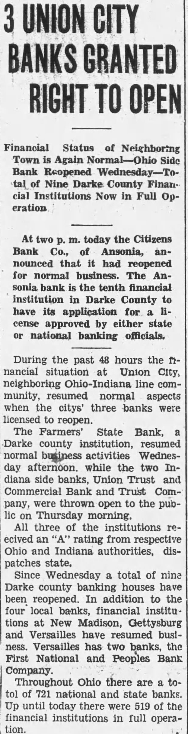 UNION RIGHT Financial Status Town Again Bank Reopened tal of Nine Darke County Financial Institutions Now in Full Operation today the Citizens Bank Co., of Ansonia, announced that had reopened for normal business. The Ansonia bank is the tenth financial institution in Darke County have its application for cense approved by either state national banking officials. During the past 48 hours the nancial situation at Union City, neighboring Ohio-Indiana line community, resumed normal aspects when the citys' three banks were licensed to reopen. The Farmers' State Bank, Darke county institution, resumed normal business activities Wednesday afternoon. while the two Indiana side banks, Union Trust and Commercial Bank and Trust Company, were thrown open to the public on Thursday morning. All three of the institutions reecived an "A" rating from respective Ohio and Indiana authorities, dispatches state. Since Wednesday total of nine Darke county banking houses have been reopened. In addition to the four local banks, financial institutions at New Madison, Gettysburg and Versailles have resumed busiVersailles has two banks, the First National and Peoples Bank Company. Throughout Ohio there are totol of 721 national and state banks. Up until today there were 519 of the financial institutions in full operation.