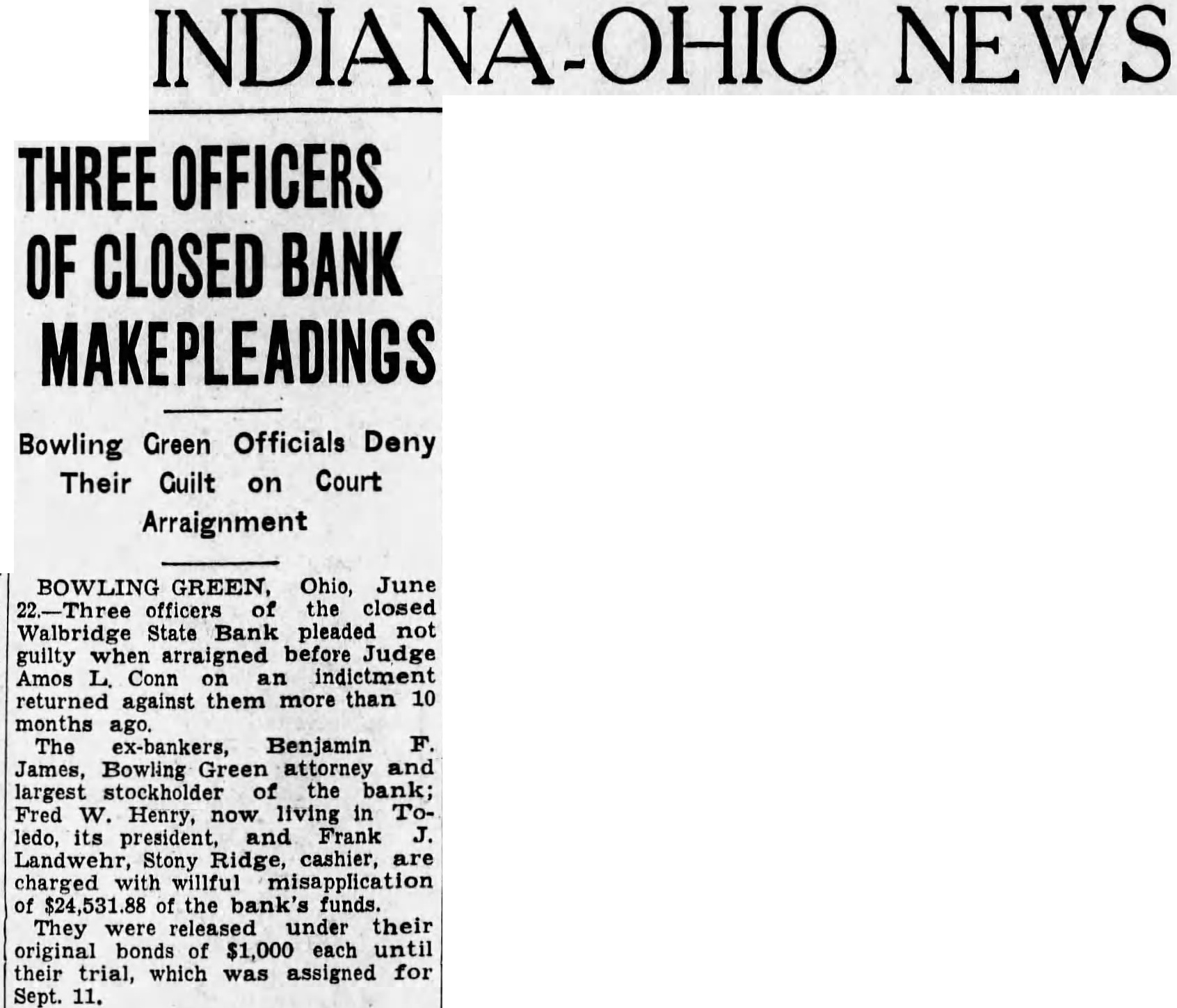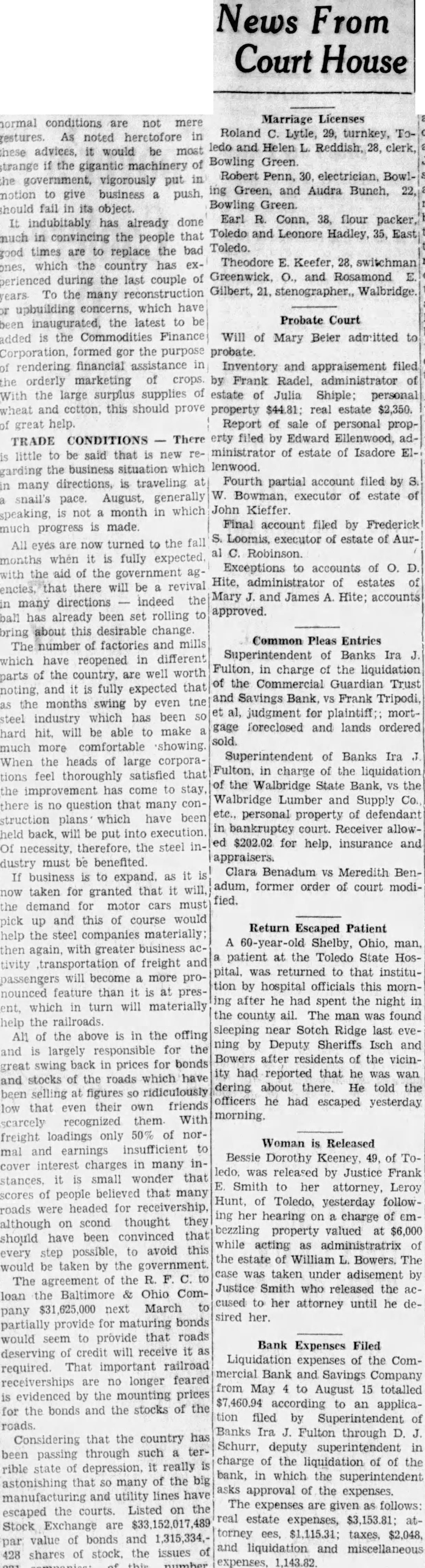 Marriage Licenses Roland Lytle, turnkey, and Helen clerk, Bowling Green. Robert Penn, 30. electrician, ing Green, and Audra Bunch, Bowling Green. Earl Conn, 38, flour packer, Toledo and Leonore Hadley, Toledo. Theodore Keefer, switchman Greenwick, and Rosamond Gilbert, stenographer,, Walbridge. Probate Court Will of Mary Beier probate. Inventory and appraisement by Frank Radel, administrator estate of Julia Shiple; personal property real estate $2,350. Report of sale of personal filed by Edward Ellenwood, ministrator of estate of Isadore lenwood. Fourth partial account filed by Bowman, executor of estate John Kieffer Final account filed by Frederick executor of estate of Robinson. Exceptions accounts of administrator of estates and James Hite; accounts Common Pleas Entries Superintendent of Banks Ira in charge the liquidation the Commercial Guardian Trust Savings Bank. Frank Tripodi, judgment for plaintiff;: mortforeclosed and lands ordered Superintendent of Banks Ira in charge of the liquidation the Walbridge State Bank, the Walbridge Lumber and Supply Co. personal property of defendant bankruptcy court. Receiver for help. insurance appraisers. Benadum Meredith former order of court Return Escaped Patient Shelby, Ohio, patient the Toledo State Hosreturned to that instituhospital officials this after he had spent the night the county ail. The man was found sleeping near Sotch Ridge last ning Deputy Sheriffs Isch and after residents of the vicinreported that he wan about there. He told the he had escaped yesterday Woman is Released Bessie Dorothy Keeney, of was released by Justice Frank Smith to her attorney, Leroy of yesterday followhearing charge of property valued at acting administratrix estate of William Bowers. The was taken under adisement Smith who released the to her attorney until he her. Bank Expenses Filed Liquidation expenses of the Commercial Bank and Savings Company May to August 15 totalled according to an applicafiled by Banks Ira Fulton through Schurr, deputy superintendent of the liquidation of of the in which the superintendent approval of the expenses. expenses given as follows: estate expenses, ees, taxes, $2,048, liquidation and miscellaneous expenses,