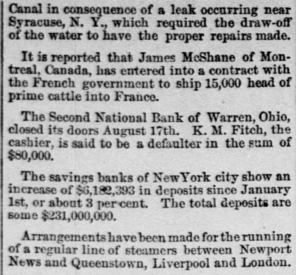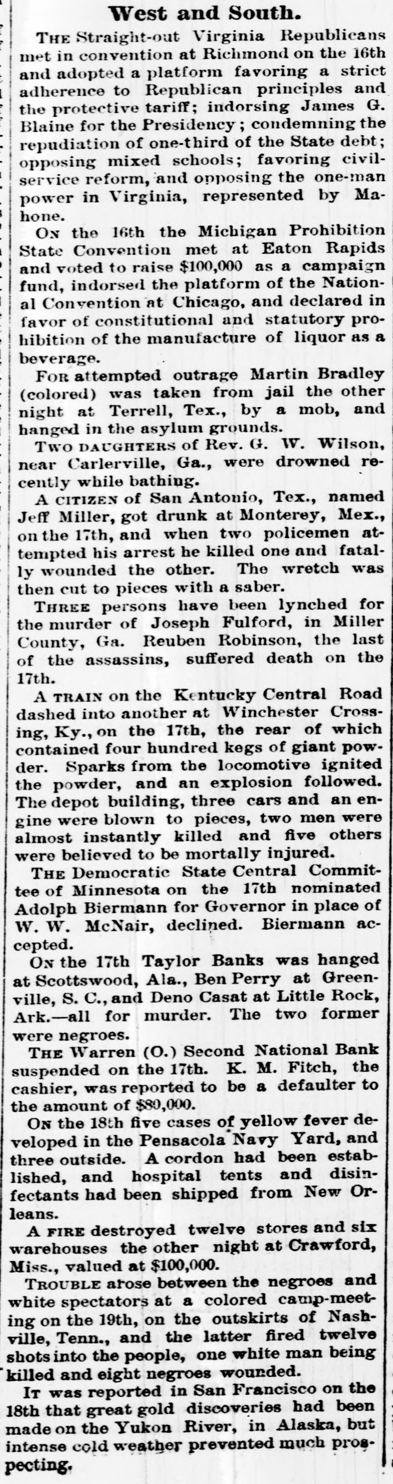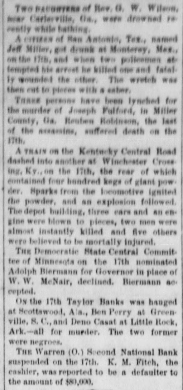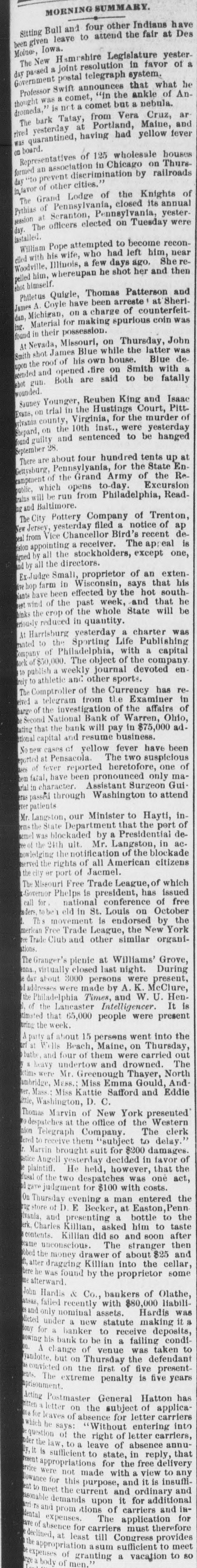 THE NEWS OF THE WEEK DEATH FROM FEAR OF HYDRO. PHOBIA. Royal Arch Versus Mari Master Masons-Giant Powder Blows 'I'wo Trains - A Machinist Finds 810,000. A man pained Perranit is reported to have died suddenly in Quebec of Canadian cholera. The United States Minister to Corea reports life there attended W ith many dis comforts and privations. The first rain that has visited Lynch burg, Virginia, for five weeks feli there yesterday week During the past six months 160 persons were killed and 401 injured in New York by railroad accidents. A number of the cigar dealers of St Louis have decided to keep their shops open on Sundays hereafter It la announced from Washington that the new postal notes will be ready for circuiation on the 31 of September next. Denuis Butler, aged 35. a resident of Mahauoy City, Pa., was killed by rail road car near Wilkesbarre, on Saturday night. The Second National Bank of Warran Ohio, suspended Friday evening. K. M Fitch, its cashier, is reported to be a de faulter for over $70,000. Right men, charged in Banks county Georgia, with Kn Klox outrages upon colored people, have been held in the United States Court. It is reported in Montreal that James MeShane, mem ber of Parliament, has contracted with the Frenth government to ship 150,000 cattle to France. J.C. McCauley, an officer in the New York Custom House, was attacked with heart disease and drowned Friday while bathing at Asbury Park. Three mills of the Arcadia Powder Company at Waverly, New York, biew up on Saturday, killing three men and injuring several others, three fatally A telegram from Troy says the Bennington Battle Monument Assouiation yesterday adopted a design submitted by Prefessor Weire. The monument is cost $100,000 John Tudor, living near Lexington Ky., discovered thiever in his meloa patch Friday night and fired pistol them, mortally wounding one of them, named Jackson. Consignments of woven wire spring beda and barbed wire made in Montreal were shipped Friday to New Zealand, being the first Canadian manufacturer Bent to that colony. The following murderers were hanged Friday Perry Cely, colored, Greenwich South Carolina Deno Casal, at Little Rock, and Tay lor Banks.color at Scottsboro, Alabama. Frederick Schoormel, a repairna. the Pennsylvania railroad felt asleep the railroad track near Middleto while drunk, ou Saturday night, and killed by a passing train. 35 feet A granite moaument, erected to the upon the club. Reuben Morse Thursday Salmi of ment $15,000 year, with The citizens Springs, York, offer for on Canandaigua Lake, between wher 19th. aud Courtney on Sep or 21st, the winner to take puree. The liabilities of Show & Boston stated by $7,509,803 assets the stated $302,290 The Royal Insurance Company Liverpool, last week took out for the erection in Chicago of a pine-s office building in ckson street, near new Chamber of Commerce, to $500,000. During a storm Sunday at Garden City, Long Island, flock shoup gath. ored under tree on the A. T. Stewart farm The tree was strack by lightning and 40 of the sheep were killed, 20 being severely injured. While boring for water at Tolono, 13 miles south of Chica vein of K88 struck at the depth of 130 feet. The has been conveyed by tubes dwelling where it is used for lighting, heating and cooking purposes. At Chautanqua Thursday, the Rev. II H. Moore of Wattsbury, lectured on Nihiliatic Philosophy, and the Rev. P. Henson of Chicago, made Piea for Old '--old folks, old culture and faith. Hewasenthusiastically applanded The Farmerr Bank of Richmond, Va. suspended Thursday. Its failure expected,as had been nsidered for some time. was established 1877, and had about $45, 000 deposit which, it is believed, will be paid in full Frank Blood, aged 26 years, was bitten by small dog, with which he was play ing, near Cobleskill, N. Y., on Thursday morning He became frantic from fell into such convulsions that three were unable to hold him. In the ing he died, solely from the effects fright. . Heavy rains fell Thursday throughou Virginia relieving the erops which suffered from the drought. The will corn crop that the tions are and much lighter than last sections only hall a crop of will be made. Official returns from 109 of the 11 counties of Kentocky give Proctor for governor, 43,571 majority. The counties expected maining eight sweil the figure to nearly 40,000, more than last year. The propor for a constitutional convention defeated. Notwithstanding a certain amount the from injury lead where resorts save the Manhattan Beach Oriental hotels. Edward J. Curry of Baltimor PA has bee committed jail, coarged th murde the to wife. reported she had died of heart disease, bn