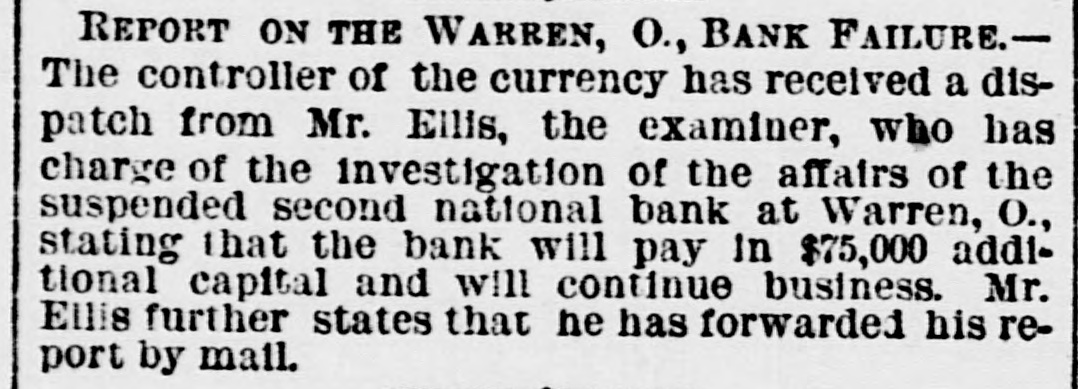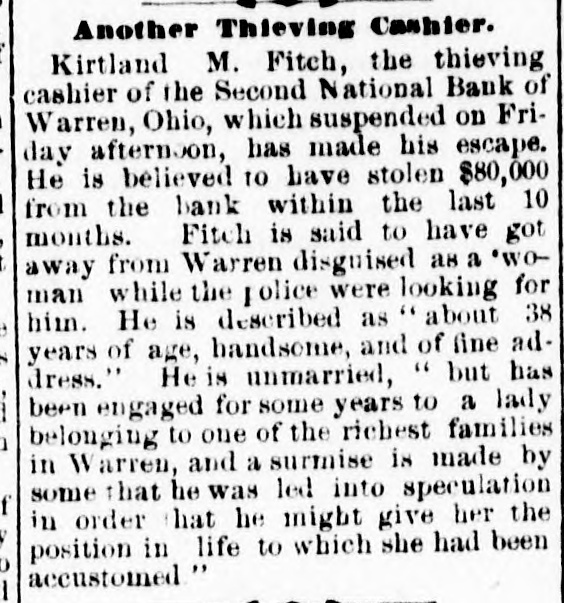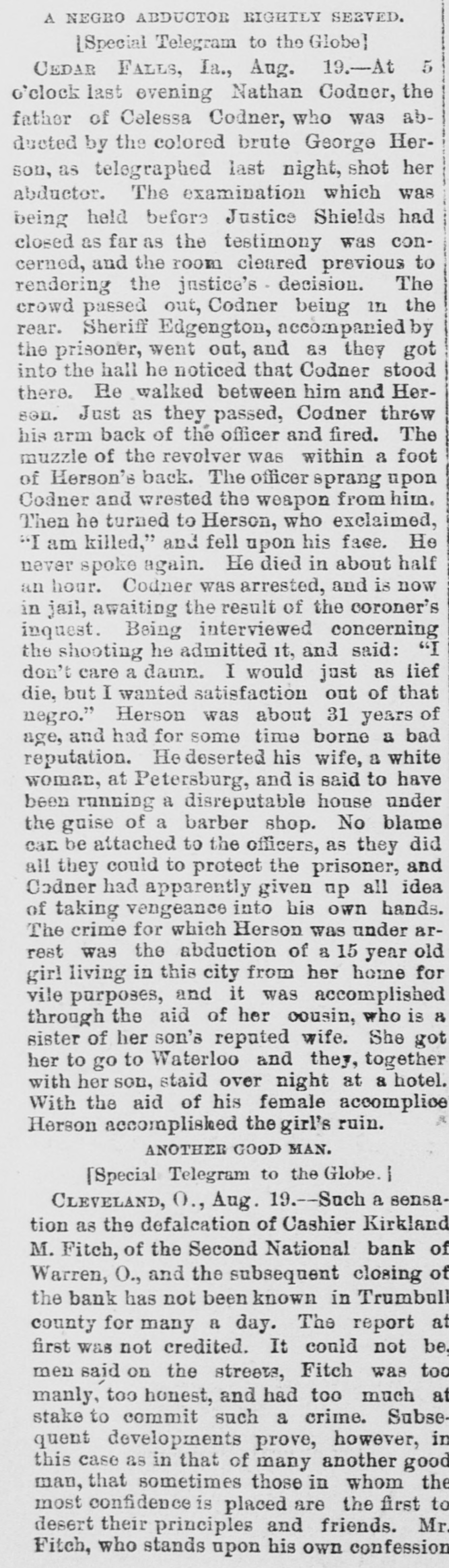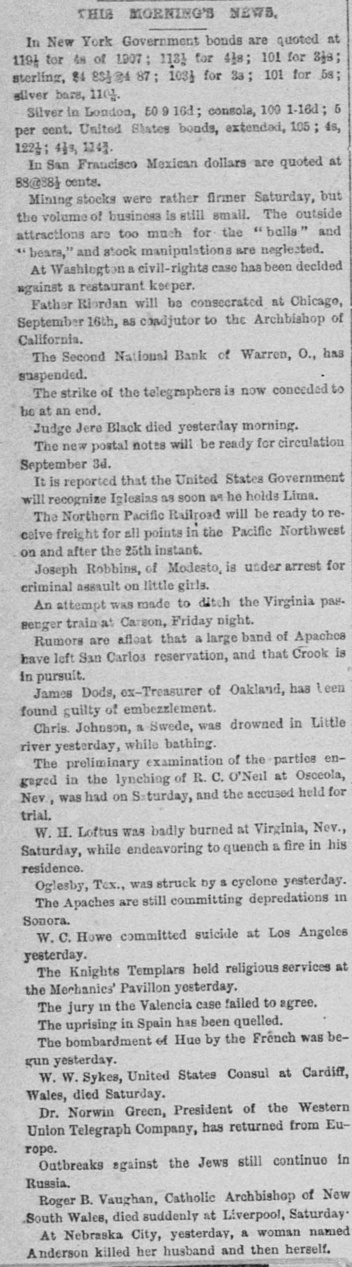 THE NEWS OF THE WEEK DEATH FROM FEAR OF HYDRO. PHOBIA. Royal Arch Versus Mari Master Masons-Giant Powder Blows 'I'wo Trains - A Machinist Finds 810,000. A man pained Perranit is reported to have died suddenly in Quebec of Canadian cholera. The United States Minister to Corea reports life there attended W ith many dis comforts and privations. The first rain that has visited Lynch burg, Virginia, for five weeks feli there yesterday week During the past six months 160 persons were killed and 401 injured in New York by railroad accidents. A number of the cigar dealers of St Louis have decided to keep their shops open on Sundays hereafter It la announced from Washington that the new postal notes will be ready for circuiation on the 31 of September next. Denuis Butler, aged 35. a resident of Mahauoy City, Pa., was killed by rail road car near Wilkesbarre, on Saturday night. The Second National Bank of Warran Ohio, suspended Friday evening. K. M Fitch, its cashier, is reported to be a de faulter for over $70,000. Right men, charged in Banks county Georgia, with Kn Klox outrages upon colored people, have been held in the United States Court. It is reported in Montreal that James MeShane, mem ber of Parliament, has contracted with the Frenth government to ship 150,000 cattle to France. J.C. McCauley, an officer in the New York Custom House, was attacked with heart disease and drowned Friday while bathing at Asbury Park. Three mills of the Arcadia Powder Company at Waverly, New York, biew up on Saturday, killing three men and injuring several others, three fatally A telegram from Troy says the Bennington Battle Monument Assouiation yesterday adopted a design submitted by Prefessor Weire. The monument is cost $100,000 John Tudor, living near Lexington Ky., discovered thiever in his meloa patch Friday night and fired pistol them, mortally wounding one of them, named Jackson. Consignments of woven wire spring beda and barbed wire made in Montreal were shipped Friday to New Zealand, being the first Canadian manufacturer Bent to that colony. The following murderers were hanged Friday Perry Cely, colored, Greenwich South Carolina Deno Casal, at Little Rock, and Tay lor Banks.color at Scottsboro, Alabama. Frederick Schoormel, a repairna. the Pennsylvania railroad felt asleep the railroad track near Middleto while drunk, ou Saturday night, and killed by a passing train. 35 feet A granite moaument, erected to the upon the club. Reuben Morse Thursday Salmi of ment $15,000 year, with The citizens Springs, York, offer for on Canandaigua Lake, between wher 19th. aud Courtney on Sep or 21st, the winner to take puree. The liabilities of Show & Boston stated by $7,509,803 assets the stated $302,290 The Royal Insurance Company Liverpool, last week took out for the erection in Chicago of a pine-s office building in ckson street, near new Chamber of Commerce, to $500,000. During a storm Sunday at Garden City, Long Island, flock shoup gath. ored under tree on the A. T. Stewart farm The tree was strack by lightning and 40 of the sheep were killed, 20 being severely injured. While boring for water at Tolono, 13 miles south of Chica vein of K88 struck at the depth of 130 feet. The has been conveyed by tubes dwelling where it is used for lighting, heating and cooking purposes. At Chautanqua Thursday, the Rev. II H. Moore of Wattsbury, lectured on Nihiliatic Philosophy, and the Rev. P. Henson of Chicago, made Piea for Old '--old folks, old culture and faith. Hewasenthusiastically applanded The Farmerr Bank of Richmond, Va. suspended Thursday. Its failure expected,as had been nsidered for some time. was established 1877, and had about $45, 000 deposit which, it is believed, will be paid in full Frank Blood, aged 26 years, was bitten by small dog, with which he was play ing, near Cobleskill, N. Y., on Thursday morning He became frantic from fell into such convulsions that three were unable to hold him. In the ing he died, solely from the effects fright. . Heavy rains fell Thursday throughou Virginia relieving the erops which suffered from the drought. The will corn crop that the tions are and much lighter than last sections only hall a crop of will be made. Official returns from 109 of the 11 counties of Kentocky give Proctor for governor, 43,571 majority. The counties expected maining eight sweil the figure to nearly 40,000, more than last year. The propor for a constitutional convention defeated. Notwithstanding a certain amount the from injury lead where resorts save the Manhattan Beach Oriental hotels. Edward J. Curry of Baltimor PA has bee committed jail, coarged th murde the to wife. reported she had died of heart disease, bn