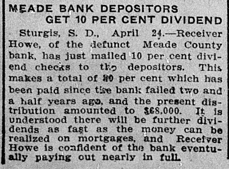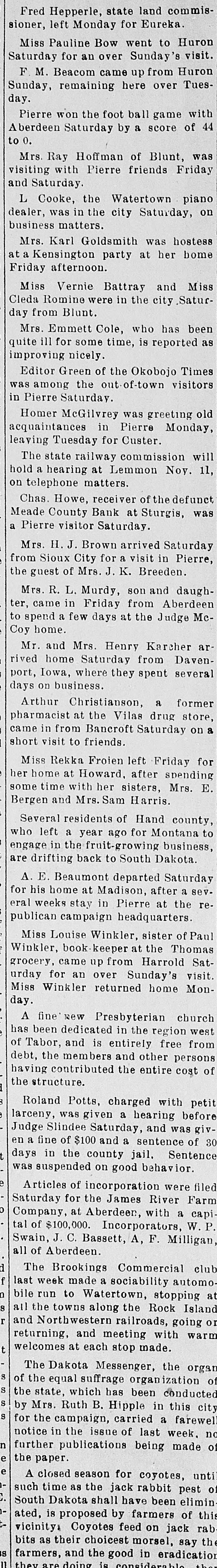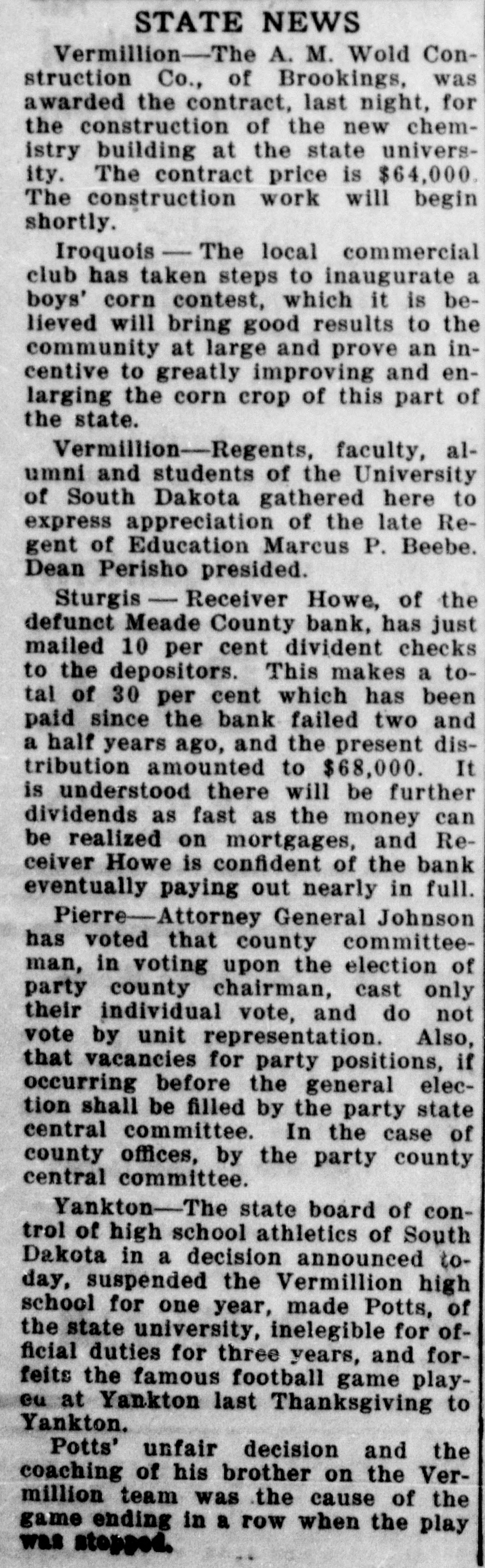 STATE NEWS Vermillion-The A. M. Wold Construction Co., of Brookings, was awarded the contract, last night, for the construction of the new chemistry building at the state university. The contract price is $64,000. The construction work will begin shortly. Iroquois - - The local commercial club has taken steps to inaugurate a boys' corn contest, which it is believed will bring good results to the community at large and prove an incentive to greatly improving and enlarging the corn crop of this part of the state. Vermillion-Regents, faculty, alumni and students of the University of South Dakota gathered here to express appreciation of the late Regent of Education Marcus P. Beebe. Dean Perisho presided. Sturgis - Receiver Howe, of the defunct Meade County bank, has just mailed 10 per cent divident checks to the depositors. This makes a total of 30 per cent which has been paid since the bank failed two and a half years ago, and the present distribution amounted to $68,000. It is understood there will be further dividends as fast as the money can be realized on mortgages, and Receiver Howe is confident of the bank eventually paying out nearly in full. Pierre-Attorney General Johnson has voted that county committeeman, in voting upon the election of party county chairman, cast only their individual vote, and do not vote by unit representation. Also, that vacancies for party positions, if occurring before the general election shall be filled by the party state central committee. In the case of county offices, by the party county central committee. Yankton-The state board of control of high school athletics of South Dakota in a decision announced today, suspended the Vermillion high school for one year, made Potts, of the state university, inelegible for official duties for three years, and forfeits the famous football game playeu at Yankton last Thanksgiving to Yankton. Potts' unfair decision and the coaching of his brother on the Vermillion team was the cause of the game ending in a row when the play was stopped.