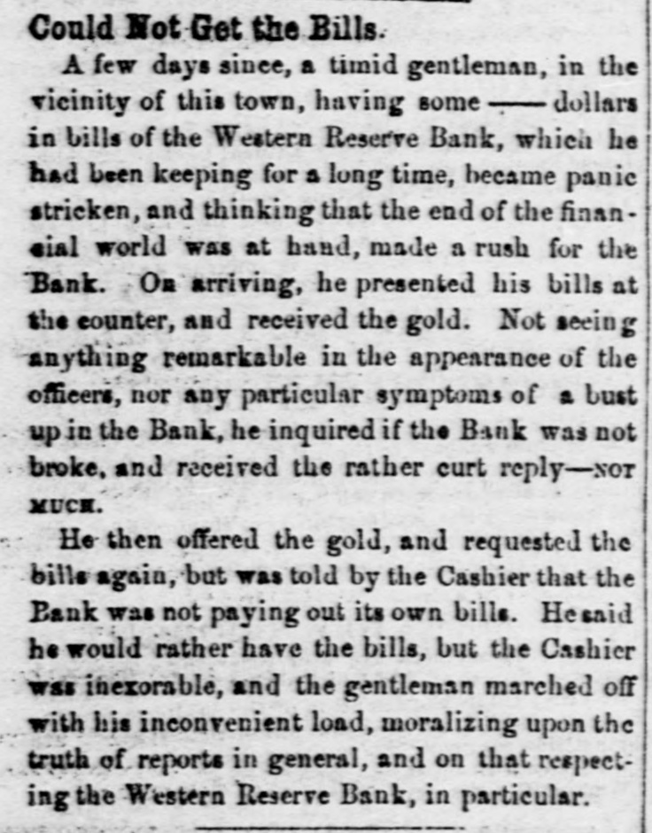 Could Not Get the Bills. A few days since, a timid gentleman, in the vicinity of this town, having some - dollars in bills of the Western Reserve Bank, which he had been keeping for a long time, became panic stricken, and thinking that the end of the finaneial world was at hand, made a rush for the Bank. On arriving, he presented his bills at the counter, and received the gold. Not seeing anything remarkable in the appearance of the officers, nor any particular symptoms of a bust up in the Bank, he inquired if the Bank was not broke, and received the rather curt reply-sor MUCH. He then offered the gold, and requested the bills again, but was told by the Cashier that the Bank was not paying out its own bills. Hesaid he would rather have the bills, but the Cashier was inexorable, and the gentleman marched off with his inconvenient load, moralizing upon the truth of reports in general, and on that respecting the Western Reserve Bank, in particular.