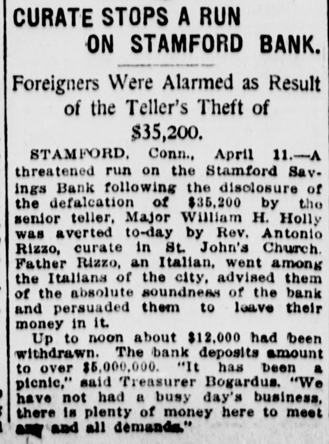 CURATE STOPS A RUN ON STAMFORD BANK. Foreigners Were Alarmed as Result of the Teller's Theft of $35,200. STAMFORD, Conn., April 11.-A threatened run on the Stamford Savings Bank following the disclosure of the defalcation of $35,200 by the senior teller, Major William H. Holly was averted to-day by Rev. Antonio Rizzo, curate in St. John's Church. Father Rizzo, an Italian, went among the Italians of the city, advised them of the absolute soundness of the bank and persuaded them to leave their money in it. Up to noon about $12,000 had been withdrawn. The bank deposits amount to over $5,000,000. "It has been a pienic," said Treasurer Bogardus. "We have not had a busy day's business, there is plenty of money here to meet and all demands."