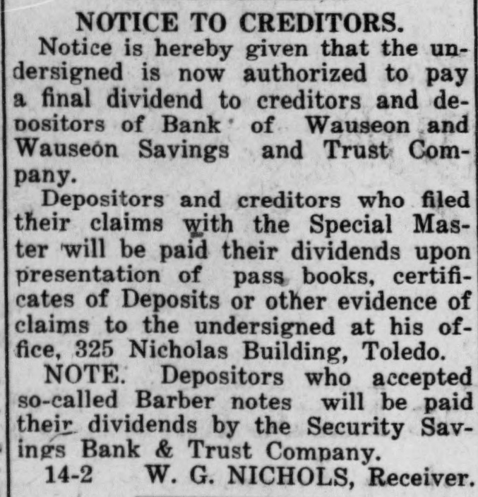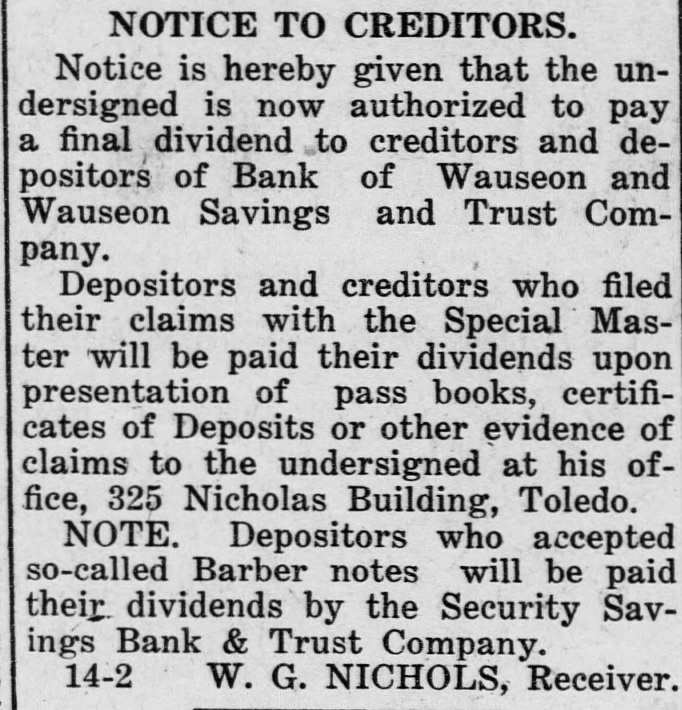 BARBER DIVIDENDS Creditors of The Barber Banks Receive Nine Per Cent, Dividend-891 Notes Presented Monday and Tuesday-Further Dividends Promised. To many of the holders of the notes of the Barber Banks the money paid by The Security Savings Bank & Trust Company as dividends on the face of the notes they held, last Monday and Tuesday came as an unexpected gift, for many of them had given up all hope of ever getting anything at all from this source. Those creditors who had declined to take Barber notes in exchange for their vouchers of claims against the Bank of Wauseon and the Wauseon Savings & Trust Company were paid their share of dividends by the receivers of these banks in Toledo. Holders of notes were paid their dividends of 9 per cent. by the banking firm named above on Monday and Tuesday in the old banking room of the Barber banks, now occupied by the Expositor officeThe office was thronged with note holders both days and when the office hours ended on Tuesday it was found that of the 1183 notes that had been issued and recorded, 891 had been presented, leaving 292 still to be heard from. Many of this last number will be presented for payment of dividends at the Security Savings Bank & Trust Company in Toledo and holders of notes who live at a distance may secure their dividends by sending their notes by mail to the above banking firm, Superior street, Toledo, inclose self addressed envelope and return postage; check for the amount of dividends due and the notes properly endorsed will be returned to the sender. The claims against the banks covered by the notes amount to $495.585.22; the total amount of dividends to be distributed is $44,602.67. The Committee of creditors, consisting of C. C. Handy, F. L. S. Darby and J. H. Johnson. reports that there are outstanding $495,585.22 par value of Barber notes, all of which are equally secured by the deposit with The Security Savings Bank & Trust Company, of Toledo, Ohio, of the following stocks and bonds, viz.: $50,000, par value of the preferred stock of Home Telephone Company of Mobile. $300.000, par value. of the common stock of the Home Telephone Company of Mobile. $225,200. par vlaue. of the 5 per cent. bonds of the Home Telephone Company of Mobile. In addition to the foregoing stocks and bonds, The Security Savings Bank & Trust Company also holds as security a cash balance of $734.86. Within a short time the interest on the'Mrhile bonds amounting to $5,360 will be paid. and thereafter each six months a like amount will be paid so that there should be paid in the Security Bank & Trust Company each year the sum of $11.260. being the in terest on the $225.200 of Mobile bonds. The above-mentioned $225.200 of set