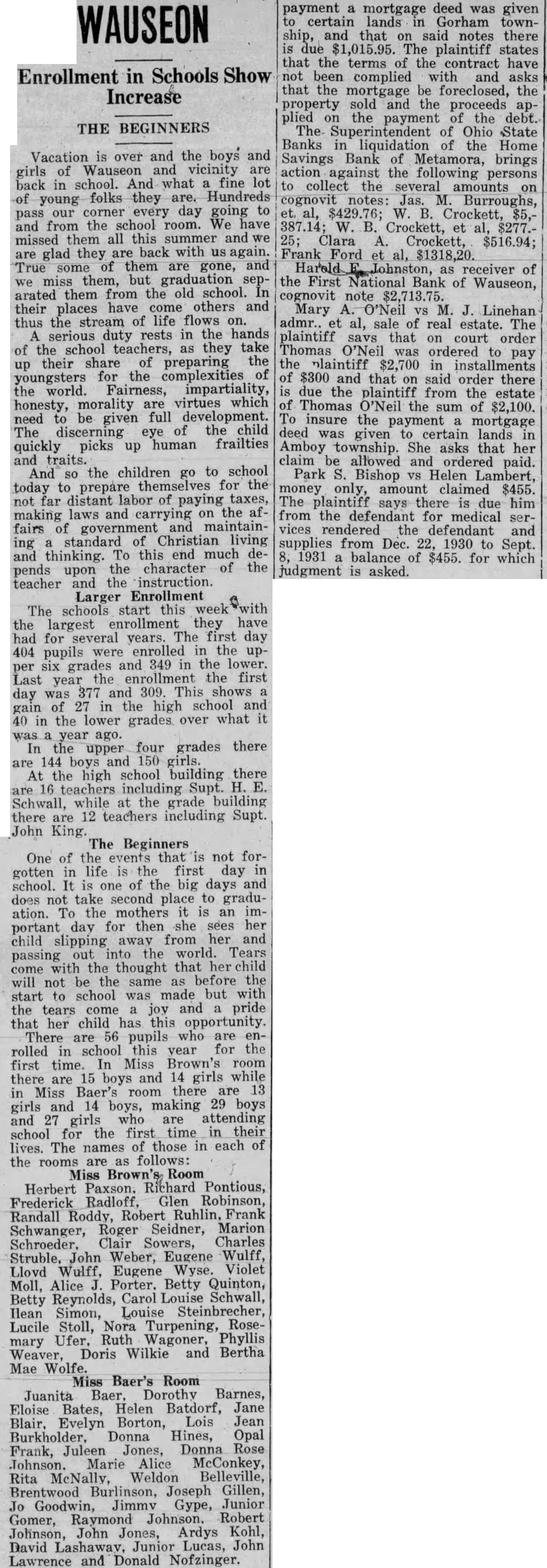 The Beginners One of the not forgotten life first day of the big days and school. one not take second place graduation. the mothers an portant day for then she child slipping from her and world. Tears the thought that come the not start school made but with was pride child has opportunity. are 56 pupils rolled school year for first time. Miss Brown's room 15 and girls while there are Baer's there 13 Miss boys, making 29 boys girls and 27 girls attending the first time their school for lives. The names those in each of the rooms follows: Miss Brown's Room Herbert Paxson. Richard Pontious, Frederick Glen Robinson, Randall Roddy, Robert Ruhlin, Frank Roger Seidner, Marion Schwanger, Sowers, Charles John Weber, Eugene Wulff, Wulff, Eugene Violet Llovd Moll, Alice Porter. Betty Quinton, Carol Schwall, Betty Reynolds, Ilean Simon, Louise Steinbrecher, Lucile Stoll, Nora Turpening, RoseUfer. Ruth Wagoner, Phyllis mary Doris Wilkie and Bertha Mae Baer's Room Juanita Baer, Dorothy Barnes, Eloise Bates, Helen Batdorf, Jane Blair, Evelyn Borton, Lois Jean Donna Hines, Opal Frank, Juleen Jones, Donna Marie Alice McConkey, Weldon Belleville, Burlinson, Joseph Gillen, Goodwin, Jimmv Gype, Junior Johnson. Robert Gomer, Raymond Johnson, John Kohl, Jones, David Junior Lucas, John Lawrence Donald Nofzinger. payment mortgage deed was given certain lands Gorham townand that said notes there $1,015.95 The plaintiff states that the terms the contract have not complied asks that mortgage foreclosed, the property the proceeds apthe payment the debt. Superintendent Ohio State Banks the Home Savings Bank Metamora, brings the following collect the amounts on Burroughs, B. Clara Crockett, $516.94; Frank Ford receiver of the First National Bank of Wauseon, cognovit note $2,713.75. Mary O'Neil Linehan admr. al, of real estate. The plaintiff savs that court order Thomas O'Neil ordered pay the plaintiff $2,700 of $300 that said order there due the plaintiff from the estate Thomas the of $2,100. insure the payment mortgage deed certain lands Amboy township. She asks that her claim allowed and ordered paid. Bishop vs Helen Lambert, only, amount $455. The says there him from the for medical vices the defendant from Dec. 1930 Sept. 1931 balance $455. for which judgment is asked.
