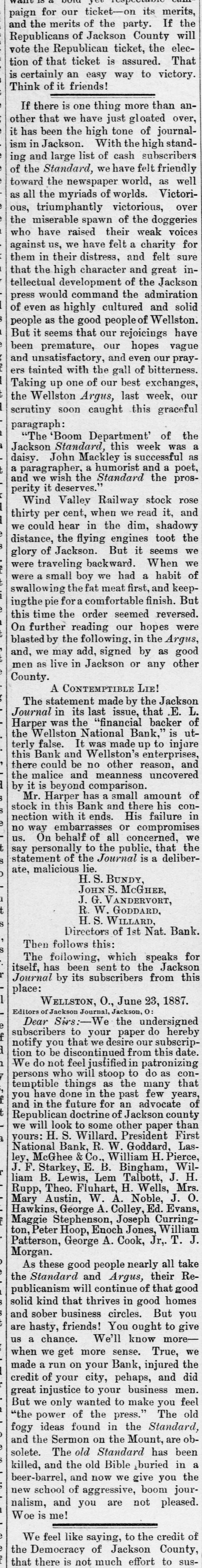 merits, for our ticket-on its If the paign merits of the party. will and Republicans the Republican of Jackson ticket, County the elec- That vote the that ticket is assured. tion certainly of an easy way to victory. is Think of it friends! there is one thing more than over, anIf that we have just gloated journalother the high tone of ism it has in been Jackson. With of cash the subscribers high standing and Standard, large list we have felt friendly well of toward the the newspaper world, Victori- as all the myriads of worlds. over as triumphantly victorious, doggeries raised ous, the miserable spawn their of the weak voice3 who have us, we have felt a charity felt sure for against in their distress, and great inthem high character and Jackson that the development of the tellectual would command the admiration solid press as highly cultured Wellston. and of even as the good people of have people it seems that our rejoicings vague But premature, our hopes praybeen unsatisfactory, and even bitterness. our and tainted with the gall of exchanges, ers up one of our best week, our Taking Argus, last scrutiny the Wellston soon caught this graceful paragraph: 'Boom Department' week of was the "The Standard, this successful as Jackson John Mackley humorist is and a poet, daisy. and a paragrapher we wish the a Standard the prosperity Wind it deserves. Valley when Railway we read stock it, rose and thirty per hear cent, in the dim, shadowy toot the distance, we could the flying engines it seems we of Jackson. But When we glory traveling backward. a habit of swallowing were were a small for the boy a fat comfortable we meat had first, finish. and keep- But ingthe pie order seemed reversed. this time the reading our hopes the Argus, were On further by the following, in as good blasted may add, signed by other County. and, men we as live in Jackson or any CONTEMPTIBLE LIE! Jackson statement A made by the that E. L. of Journal The was in the its last "financial issue, Bank,' backer is utHarper National injure the Wellston It was made up enterprises, to terly Bank false. and Wellston's reason, and this could be no other uncovered beyond the there by it malice is and comparison. meanness small amount of Mr. Harper Bank has a and there his con- in stock in with this it ends. His compromises failure nection no way embarrasses of all or concerned, the we us. On behalf to the public, a that deliberstatement of say personally the Journal is ate, malicious H. lie. S. BUNDY, JOHN S. McGHEE, J. G. VANDERVORT, R. W. GODDARD. H.S. WILLARD, Directors of 1st Nat. Bank. Then follows this: for The following, which the speaks Jackson place: Journal itself, has by been its subscribers sent to from this Jackson, WELLSTON, O., June 23, o: 1887. Editors Dear of Jackson Sirs:- Journal, We the undersigned do hereby you from subscribers that to your we desire paper our subscrip- this date. who will many tion notify We do to not be discontinued feel justified stoop the to in patronizing do as con- that persons things as past few years, of you have future for an county temptible and in the done in the of Jackson advocate doctrine other paper than we will H.S. Willard. Goddard, LasRepublican look to some W. President First National yours: Bank, R. William H. Pierce, Willey, McGhee Starkey, & Co., E. B. Bingham, Talbott, J H. J. F. B. Lewis, Lem H. Wells, Mrs. O. Rupp, Theo. W. A. Noble, Ed. Evans, Mary liam Austin, Fluhart A. Colley, Curring- J. Hawkins, George Joseph William Maggie Stephenson, Enoch Jones, Jr,. T. J. ton, Peter George A. Cook, good people their Patterson, Morgan. these Hoop, nearly all take ReAs and Argus, good publicanism the Standard that will thrives continue in good of that homes you us a and hasty, friends! You know moresolid are sober kind chance. business We'll circles. sense. ought True, But to give we when we get on more your Bank, injured and the did made a run city, pehaps, men. credit injustice of your to your business you feel great only wanted to make The old "the But we power found of the in press." the Standard, ideas Mount, are oband the The old Standard has in solete. fogy Sermon on Bible the buried been the a killed, and the old we give you beer-barrel, and now boom jourWoe is me! new nalism, school and of you aggressive, are not pleased. feel like saying, to the credit County, of that the We Democracy there is not of much Jackson effort to sus-