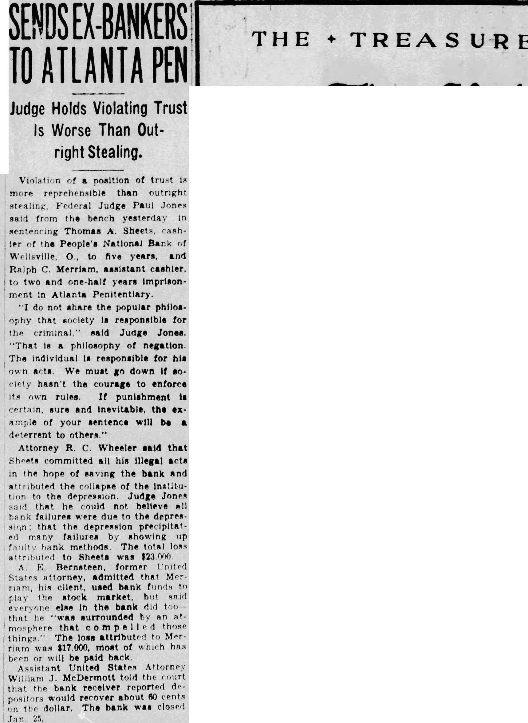SENDS EX-BANKERS THE TREASURE TO ATLANTA PEN Judge Holds Violating Trust Is Worse Than Outright Stealing. Violation of a position of trust is reprehensible than outright stealing Federal Judge Paul Jones said from the bench yesterday in sentencing Thomas A Sheets cashter the People's National Bank of Wellsville O., to five years. and Ralph C. Merriam. assistant cashier to two and one-half years imprison ment in Atlanta Penitentiary do not share the popular philosophy that society is responsible for the criminal said Judge Jones "That is A philosophy of negation The individual is responsible for his We must down If hasn't the courage to enforce rules If punishment is sure and inevitable. the ex ample of your sentence will be deterrent to others Attorney R. C. Wheeler said that committed all his illegal acts hope of saving the bank and the collapse of the Instituthe depression Judge Jones said that could not believe all failures due to the depres that the depression precipitat ed many failures by showing up bank methods The total loss attributed to Sheets was former States attorney. admitted that Mer riam, his client, used bank funds to the stock but play everyone else in the bank did mosphere that those things The loss attributed to Merriam was $17,000, most of which has been be paid back Assistant United States Attorney William J. McDermott told the court the bank receiver reported dethat positors would recover about 60 cents the dollar. The bank was closed Jan