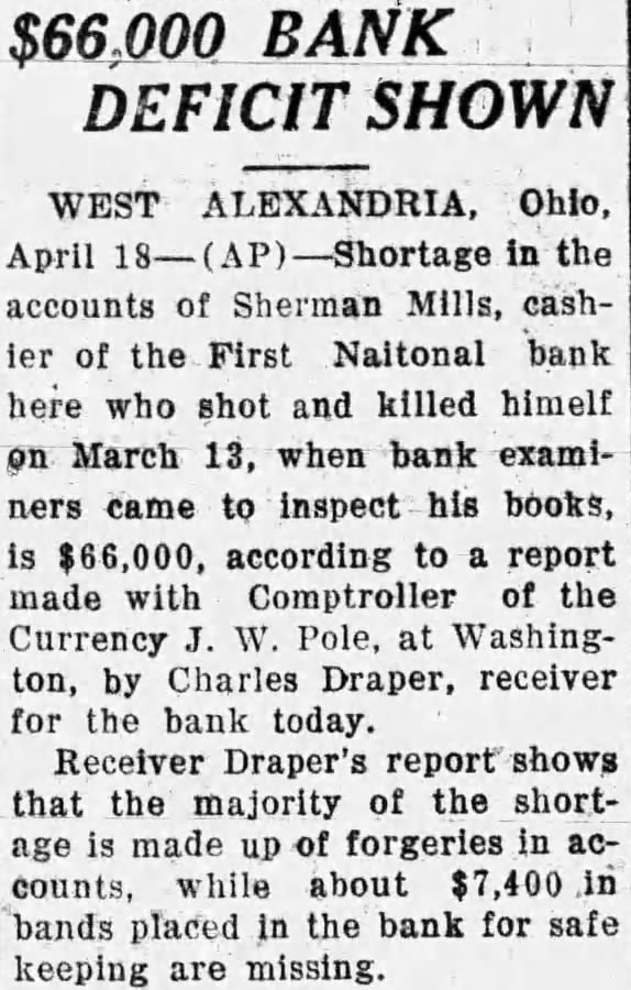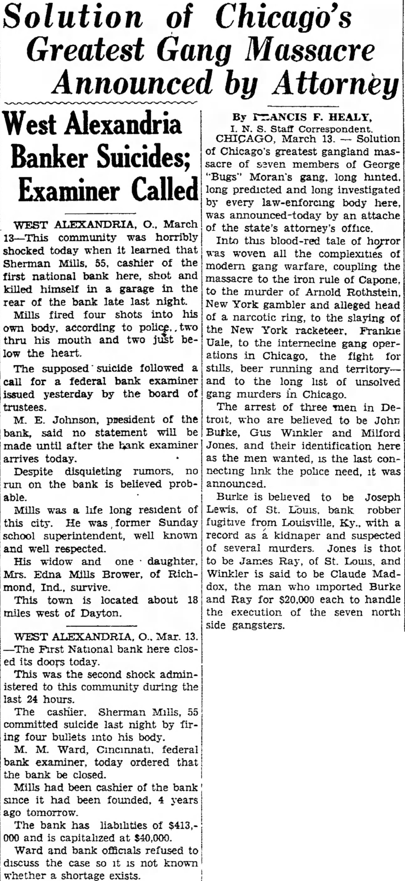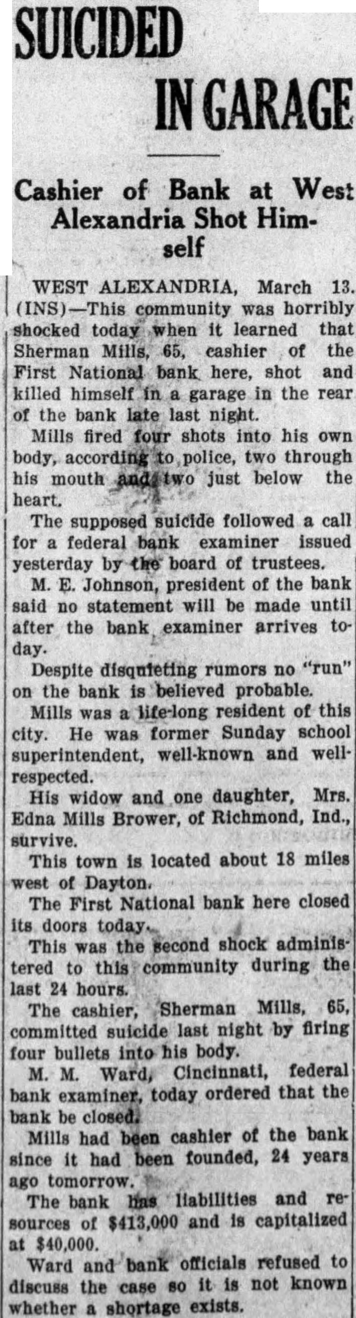 WEST ALEXANDRIA, March 13. (INS)-This community was horribly shocked today when it learned that Sherman Mills, 65. cashier of the First National bank here. shot and killed himself a garage in the rear of the bank late last night. Mills fired four shots into his own body, according to police, two through his mouth and two just below the heart. The supposed suicide followed a call for a federal bank examiner issued yesterday by the board of trustees. M. E. Johnson, president of the bank said no statement will be made until after the bank examiner arrives today. Despite disquieting rumors no "run" on the bank is believed probable. Mills was a life-long resident of this city. He was former Sunday school superintendent, well-known and wellrespected. His widow and one daughter, Mrs. Edna Mills Brower, of Richmond, Ind., survive. This town is located about 18 miles west of Dayton. The First National bank here closed its doors today. This was the second shock administered to this community during the last 24 hours. The cashier, Sherman Mills, 65, committed suicide last night by firing four bullets into his body. M. M. Ward, Cincinnati, federal bank examiner, today ordered that the bank be closed. Mills had been cashier of the bank since it had been founded, 24 years ago tomorrow. The bank has liabilities and re: sources of $413,000 and is capitalized at $40,000. Ward and bank officials refused to discuss the case 80 it is not known whether a shortage exists.