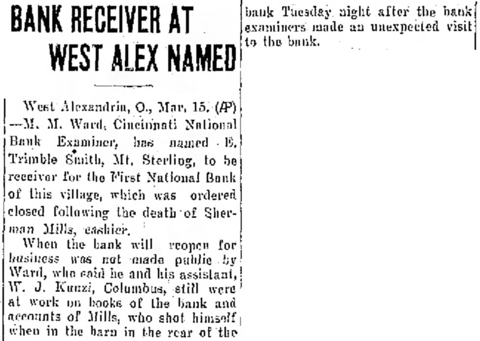West Alexandrin, O., Mar. 15. (AP) M. M. Ward, Cincinnati National Bank Examiner, has named E. Trimble Smith, Mt. Sterling, to be receiver for the Mirst National Bank of this village, which was ordered closed following the death of Sherman Mills, eashier. When the bank will reopen for business was not made public by Ward, who said he and his assistant, W. J. Kunzi, Columbus, still were at work on books of the bank and accounts of Mills, who shot himself when in the barn in the rear of the bank Tuesday night after the bank examiners made an unexpected visit to the bank.