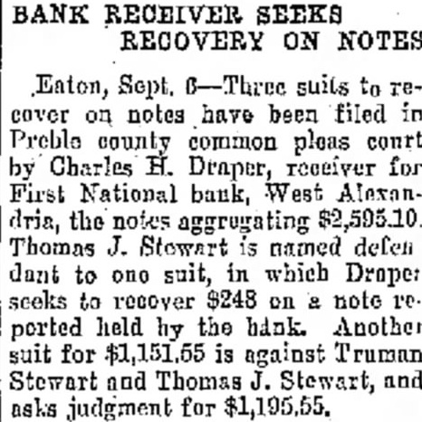 Eaton, Sept. 6-Three suits to recover on notes have been filed in Preble county common pleas court by Charles H. Draper, receiver for First National bank, West Alexandria, the notes aggregating $2,595.10 Thomas J. Stowart is named defen dant to ono suit, in which Drope: seeks to recover $248 on & note re. ported held by the bank. Another suit for $1,151.55 is against Truman Stewart and Thomas J. Stewart, and asks judgment for $1,195.55.
