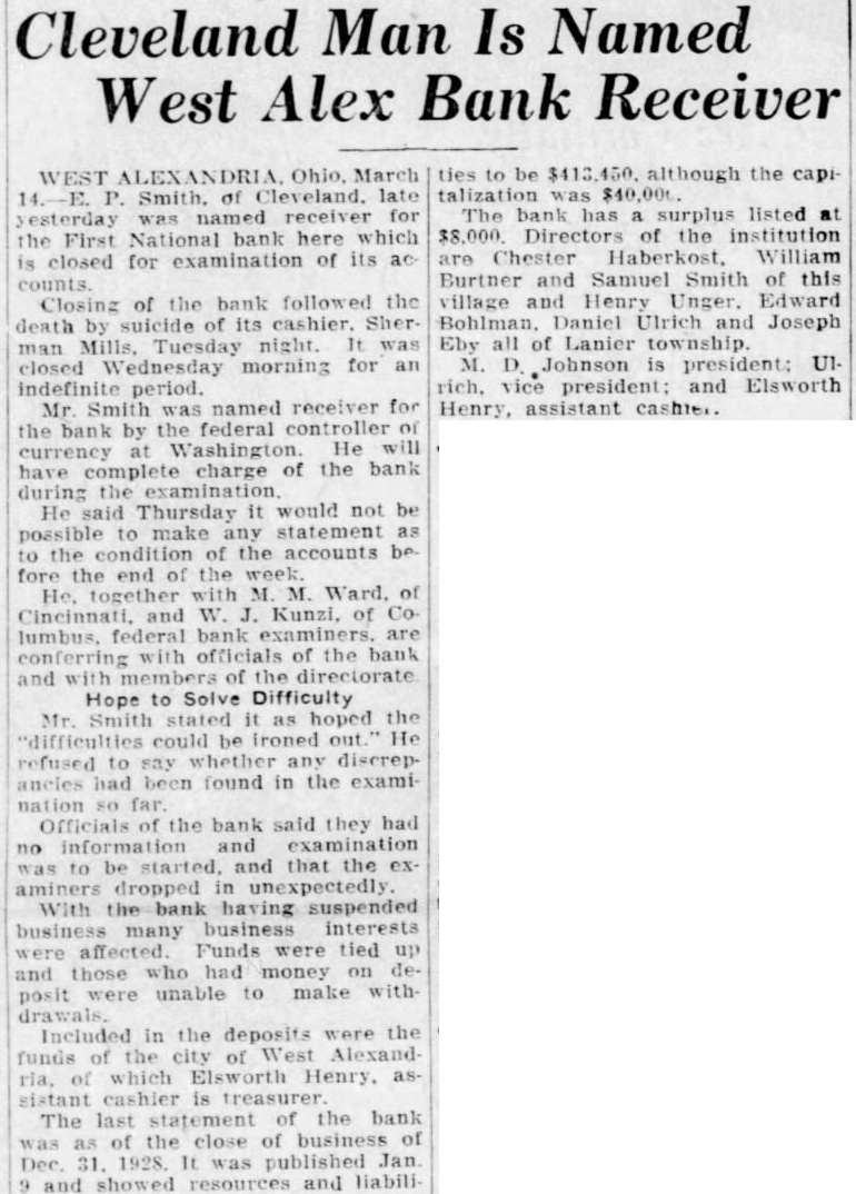 WEST March receiver the First National bank here which closed for examination of its Closing of the bank followed the death by of its cashier. Sherman Mills. Tuesday closed morning for an period. Smith named receiver for Mr the bank by the federal controller He currency complete charge of the bank have during the He Thursday would not make any statement to the of the accounts fore the end the Ward. and Kunzi, of lumbus. bank with officials of the bank and of directorate Hope to Solve Difficulty Smith hoped the Mr. as "difficulties could He to say discrephad been found in the examiof the bank said they had and and that the aminers dropped bank suspended many business interests Funds were tied those who had money posit unable to make Included in the deposits of West Alexand funds of city which Henry. sistant cashier The last statement of the bank 31. It published Jan and showed and ties to be the capiThe bank has surplus listed at Directors of the institution Chester William Burtner and Samuel Smith of this village and Henry Unger, Edward Bohlman, Daniel Ulrich and Joseph Eby all Lanier rich. vice president: and Elsworth Henry, assistant cashier.