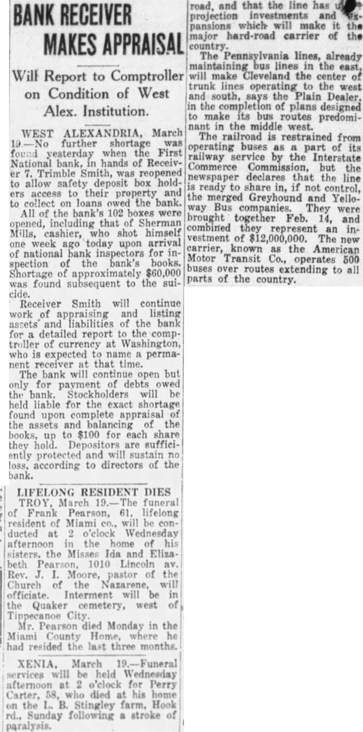 XENIA, March Funeral services will be held Wednesday afternoon at 2 o'clock for Perry Carter, 58. who died at his home on the L. Stingley farm, Hook rd., Sunday following a stroke of paralysis. road, and that the line has projection and pansions which will make it the major hard-road carrier of the country. The Pennsylvania lines, already maintaining bus lines in the east, will make Cleveland the center of trunk lines operating to the west and south, says the Plain Dealer, in the completion of plans designed to make its bus routes predominant in the middle west. The railroad is restrained from operating buses as part its railway service by the Interstate Commerce Commission, but the newspaper declares that the line is ready to share in, if not control, the merged Greyhound and Yelloway Bus companies. They were brought together Feb. 14, and combined they represent an investment of $12,000,000. The new carrier, known as the American Motor Transit Co., operates 500 buses over routes extending to all parts of the country.
