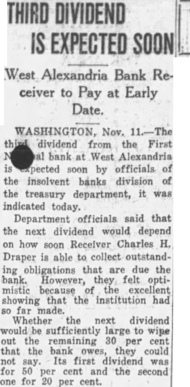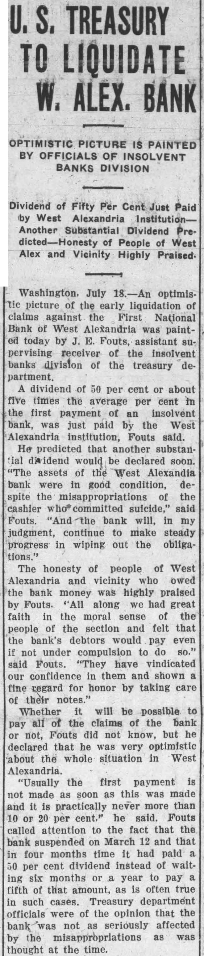 Dividend of Fifty Per Paid by West Alexandria Institution Another Substantial Dividend Preof People of West Alex and Vicinity Highly Praised. tic picture of the early liquidation of claims against the First National Bank of West Alexandria was painted today by E. Fouts, assistant supervising receiver of the insolvent banks division of the treasury department. A dividend of 50 per cent or about five times the average per cent in the first payment of an insolvent bank, was just paid by the West Alexandria institution, Fouts said. He predicted that another substantial dividend would be declared soon. assets of the West Alexandia bank were in good condition, despite the misappropriations of the cashier committed suicide," said Fouts. bank will, in my judgment, continue to make steady progress in wiping out the obligations."
