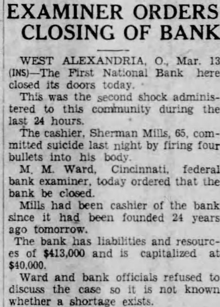 WEST ALEXANDRIA O., Mar 13 (INS)-The First National Bank here closed its doors today This was the second shock administered to this community during the last 24 hours. The cashier, Sherman Mills, 65, committed suicide last night by firing four bullets into his body M. M. Ward, Cincinnati, federal bank examiner, today ordered that the bank be closed. Mills had been cashier of the bank since it had been founded 24 years ago tomorrow. The bank has liabilities and resources of $413,000 and is capitalized at $40,000. Ward and bank officials refused to discuss the case so it is not known whether a shortage exists.