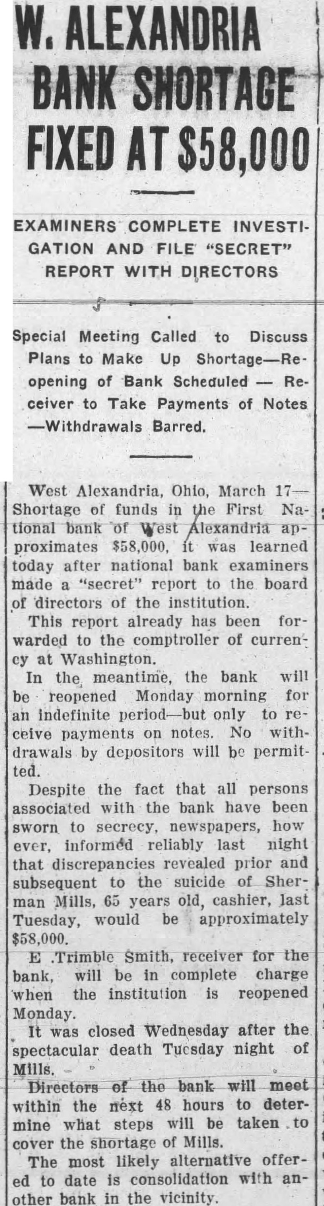 Despite the fact that all persons associated with the bank have been sworn to secrecy, newspapers, how ever, informed reliably last night that discrepancies revealed prior and subsequent to the suicide of Sherman Mills, 65 years old, cashier, last Tuesday, would be approximately $58,000. Trimble Smith, receiver for the bank, will be in complete charge when the institution is reopened Monday. It was closed Wednesday after the spectacular death Tuesday night of Mills. bank will meet within the next 48 hours determine what steps will be taken to cover the shortage of Mills. The most likely alternative offerto date is consolidation with another bank in the vicinity.