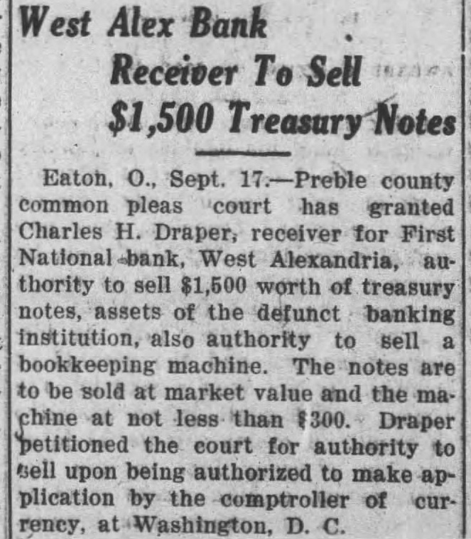 Eaton, O., Sept. 17.-Preble county common pleas court has granted Charles H. Draper, receiver for First National bank, West Alexandria, authority to sell $1,500 worth of treasury notes, assets of the defunct banking institution, also authority to sell bookkeeping machine. The notes are to be sold at market value and the machine at not less than $300. Draper petitioned the court for authority to sell upon being authorized to make application by the comptroller of currency, at Washington, D. C.