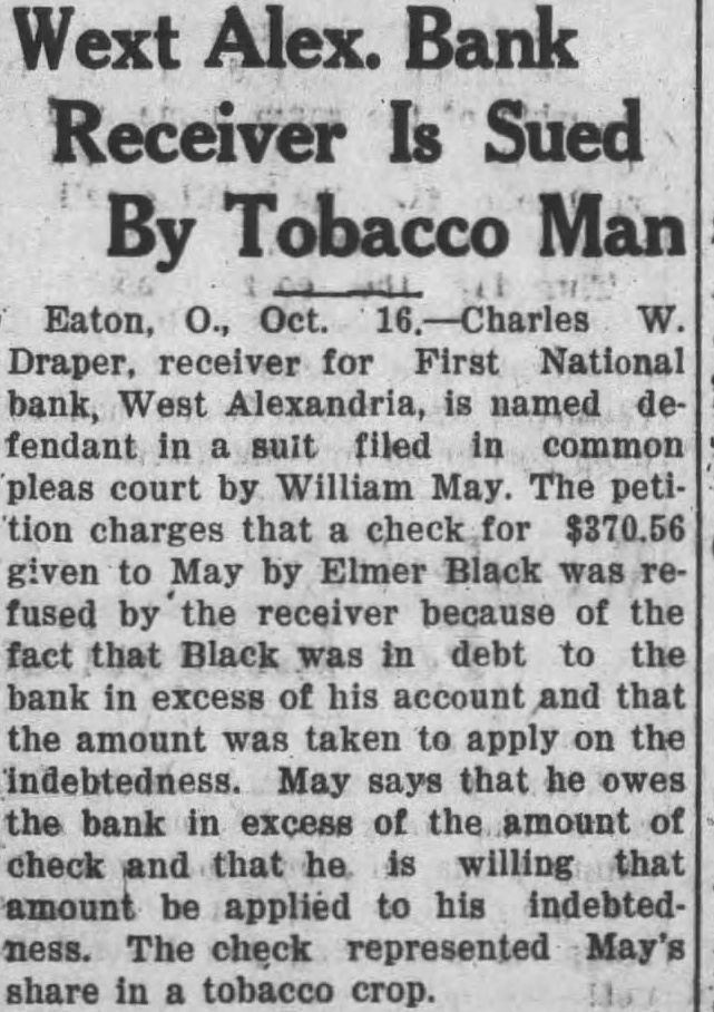 Eaton, O., Oct. 16.-Charles W. Draper, receiver for First National bank, West Alexandria, is named defendant in a suit filed in common (pleas court by William May. The petition charges that a check for $370.56 given to May by Elmer Black was refused by the receiver because of the fact that Black was in debt to the bank in excess of his account and that the amount was taken to apply on the indebtedness. May says that he owes the bank in excess of the amount of check and that he is willing that amount be applied to his indebted ness. The check represented May's share in tobacco crop.
