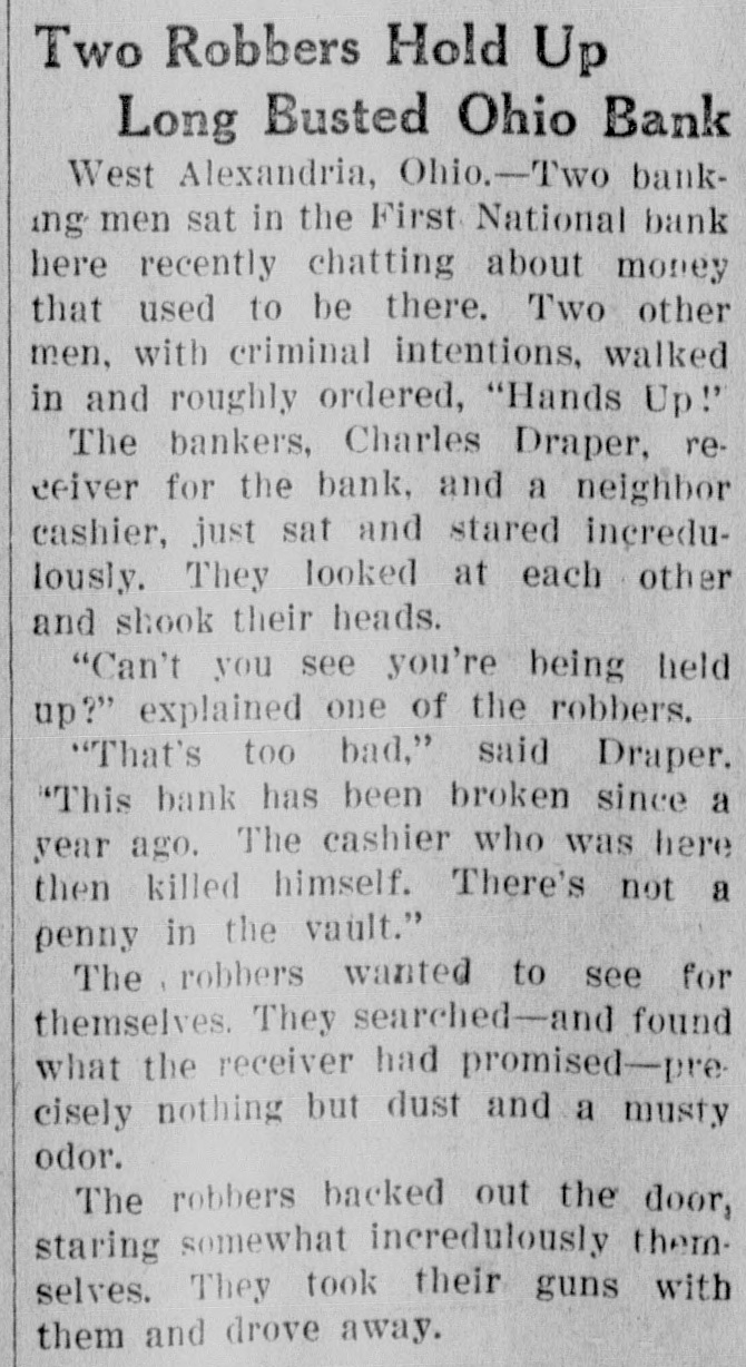 The bankers, Charles Draper, receiver for the bank, and a neighbor cashier, just sat and stared incredulously. They looked at each other and shook their heads.