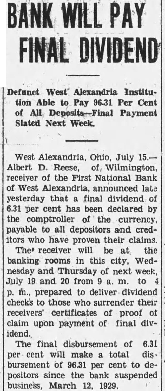 West Alexandria, Ohio, July Albert Reese, of, Wilmington, receiver of the First National Bank West Alexandria, announced late yesterday that final dividend of per cent has been declared by the comptroller of the currency, payable to all depositors and creditors who have proven their claims. The receiver will at the banking rooms in this city, Wednesday and Thursday of next week, July 19 and 20 from to prepared to deliver dividend checks to those who surrender their receivers' certificates of proof of claim upon payment final dividend. The final disbursement of 6.31 per cent will make total disbursement of 96.31 per cent to depositors since the bank suspended business, March 12, 1929.