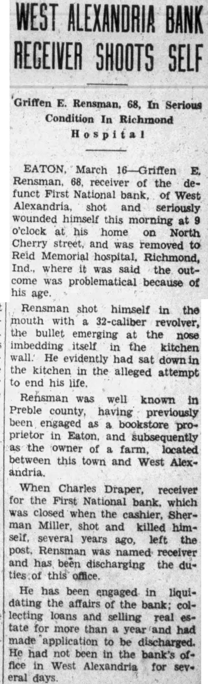 EATON, March 16-Griffen Rensman, 68, receiver of the funct First National bank, of West Alexandria, shot and seriously wounded himself this morning o'clock his home on Cherry street, and was removed Reid Memorial hospital, Richmond, Ind., where it was said the outcome was problematical because of his age.