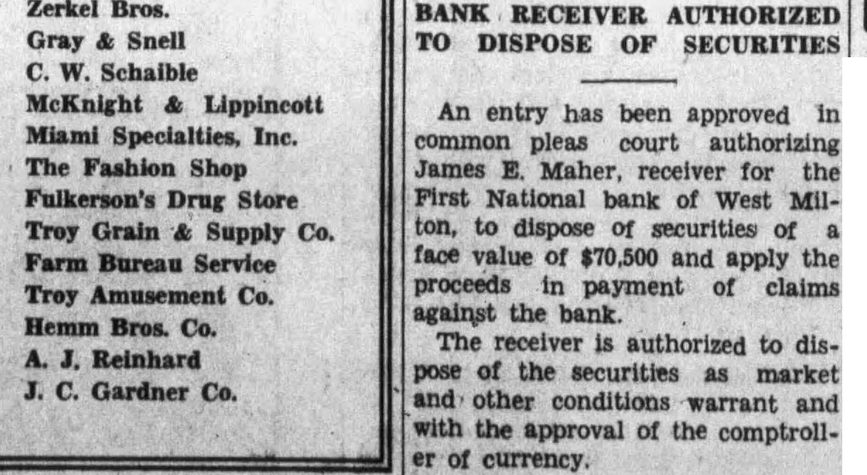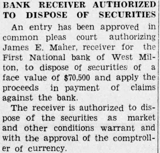 An entry has been approved in common pleas court authorizing James E. Maher, receiver for the First National bank of West Milton, to dispose of securities of face value of $70,500 and apply the proceeds in payment of claims against the bank. The receiver is authorized to dispose of the securities as market and other conditions warrant and with the approval of the comptroller of currency. Stockholders of the received notice Thursday of their double liability assessment required in the liquidation of this bank, of which amount at least 25% is due December 21, 1934.