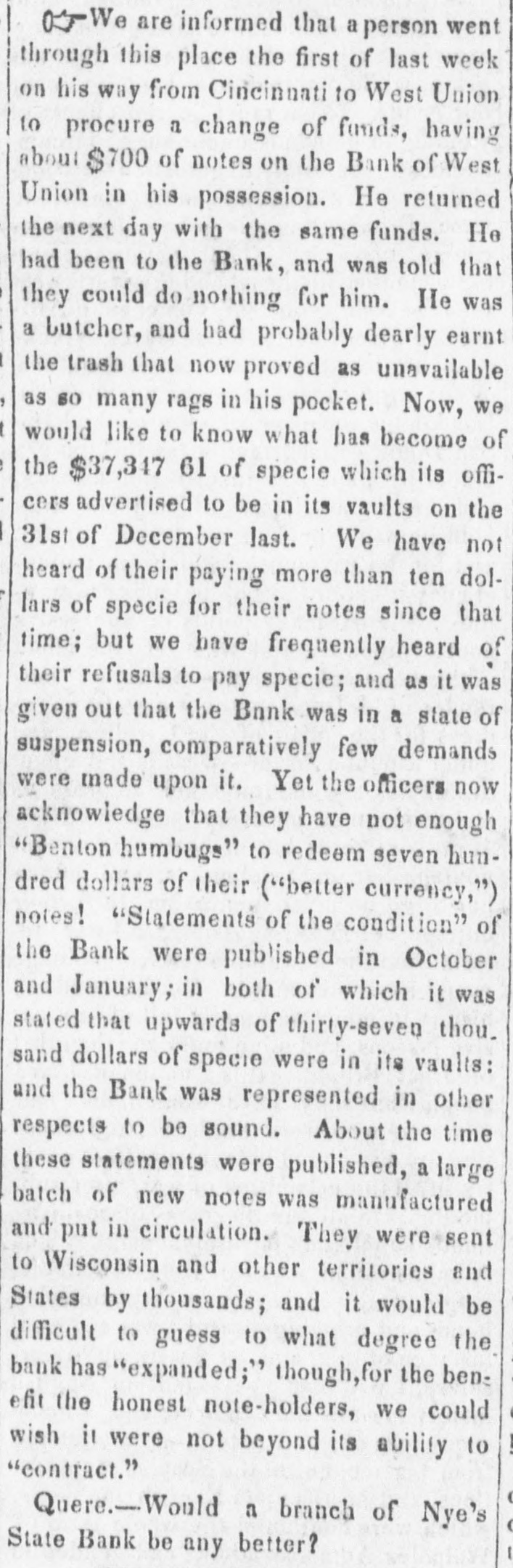 We are informed that a person went through this place the first of last week on his way from Cincinnati to West Union to procure a change of funds, having about $700 of notes on the Bank of West Union in his possession. He returned the next day with the same funds. He had been to the Bank, and was told that they could do nothing for him. He was a butcher, and had probably dearly earnt the trash that now proved as unavailable as so many rags in his pocket. Now, we would like to know what has become of the $37,347 61 of specie which its officers advertised to be in its vaults on the 31st of December last. We have not heard of their paying more than ten dollars of specie for their notes since that time; but we have frequently heard of their refusals to pay specie; and as it was given out that the Bank was in a state of suspension, comparatively few demands were made upon it. Yet the officers now acknowledge that they have not enough "Benton humbugs" to redeem seven hundred dollars of their ("better currency,") notes! "Statements of the condition" of the Bank were published in October and January; in both of which it was stated that upwards of thirty-seven thousand dollars of specie were in its vaults: and the Bank was represented in other respects to be sound. About the time these statements were published, a large batch of new notes was manufactured and put in circulation. They were sent to Wisconsin and other territories and States by thousands; and it would be difficult to guess to what degree the bank has "expanded;" though, for the benefit the honest note-holders, we could wish it were not beyond its ability to "contract." Quere. Would a branch of Nye's State Bank be any better?