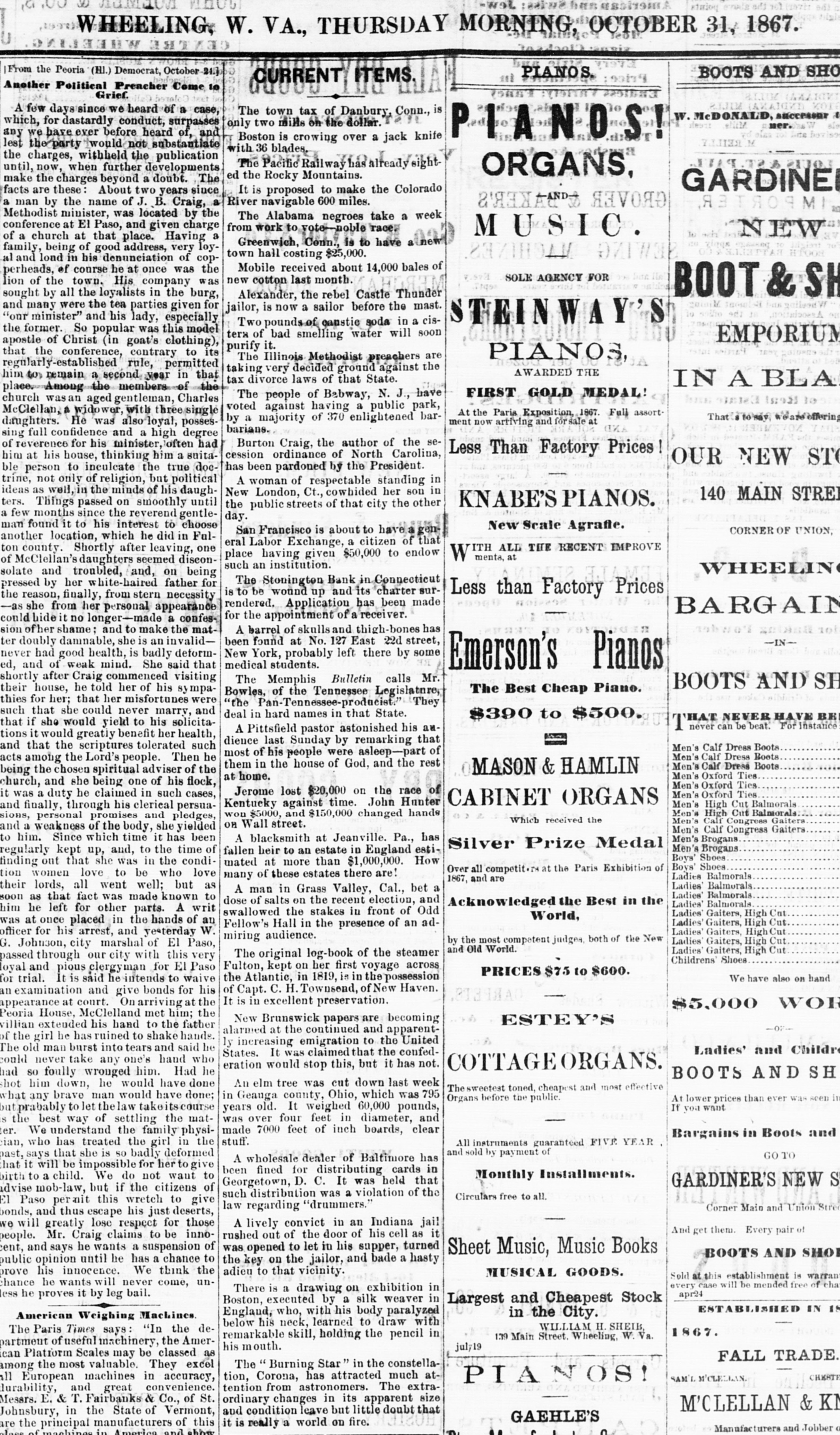 WHEELING. W. VA., THURSDAY MORNING. OCTOBER 31, 1867. From the Peoria (HI.) Democrat, October 24.) PIANOS. BOOTS AND SHO as CURRENT ITEMS. Another Political Prencher Come to 7548 Grief. A few days since we heard of a case, The town tax of Danbury, Conn., is W. McDONALD, successar which, for dastardly conduct, surpasses mer. only two mills on the dollar. any we have ever before heard of, and PIANOS! Boston is crowing over a jack knife lest the party would not substantiate with 36 blades. the charges, withheld the publication The Pacific Railway has already sightuntil, now, when further developments ORGANS, ed the Rocky Mountains. make the charges beyond a doubt. The GARDINEI facts are these: About two years since It is proposed to make the Colorado River navigable 600 miles. a man by the name of J. B. Craig, a M Methodist minister, was located by the The Alabama negroes take a week conference at El Paso, and given charge from work to vote noble race. M USIC NEW of a church at that place. Having a Greenwich, Conn. is to have new family, being of good address, very loytown hall costing $25,000. al and lond in his denunciation of copMobile received about 14,000 bales of perheads, of course he at once was the SOLE AGENCY FOR new cotton last month. lion of the town. His company was BOOT & SH sought by all the loyalists in the burg, Alexander, the rebel Castle Thunder and many were the tea parties given for jailor, is now a sailor before the mast. "our minister" and his lady, especially STEINWAY Two pounds of qaustic soda in a cisthe former. So popular was this model tera of bad smelling water will soon EMPORIUM apostle of Christ (in goat's clothing), purify it. that the conference, contrary to its PIANOS. The Illinois Methodist preachers are regularly-established rule, permitted taking very decided ground against the AWARDED THE him to remain a second year in that tax divorce laws of that State. IN A BLA place. Among the members of the FIRST GOLD MEDAL! The people of Babway, N. J., have church was an aged gentleman, Charles voted against having a public park, McClellan, a widower, with esingle At the Paris Exposition, 1867. Full assort That to say we're offering by a majority of 370 enlightened barment now arriving and for sale at daughters. He was also loyal, possesbarians. sing full confidence and a high degree of reverence for his minister, often had Burton Craig, the author of the seLess Than Factory Prices cession ordinance of North Carolina, him at his house, thinking him a suitaOUR NEW ST has been pardoned by the President. ble person to inculcate the true doctrine, not only of religion, but political A woman of respectable standing in ideas as well, in the minds of his daughNew London, Ct., cowhided her son in 140 MAIN STREE KNABE'S PIANOS. ters. Things passed on smoothly until the public streets of that city the other a few months since the reverend gentleday. man found it to his interest to choose New Scale Agrafte. San Francisco is about to have a gen CORNER OF UNION, another location, which he did in Fuleral Labor Exchange, a citizen of that ALL THE RECENT IMPROVE ton county. Shortly after leaving, one place having given $50,000 to endow W menta, at of McClellan's daughters seemed disconsuch an institution. WHEELIN solate and troubled, and, on being The Stonington Bank in Connecticut pressed by her white-haired father for is to be wound up and its charter surLess than Factory Prices the reason, finally, from stern necessity rendered. Application has been made -as she from her personal appearance BARGAIN for the appointment of a receiver. could hide it no longer-made a confession of her shame: and to make the matA barrel of skulls and shigh-bones has been found at No. 127 East 22d street, ter doubly damnable, she is an invalidnever had good health, is badly deformNew York, probably left there by some medical students. Emerson's Pianos ed, and of weak mind. She said that shortly after Craig commenced visiting The Memphis Bulletin calls Mr. BOOTS AND SH their house, he told her of his sy mpaThe Best Cheap Piano. Bowles, of the Tennessee Legislature, thies for her; that her misfortunes were "the Pan-Tennessee-producist They such that she could never marry, and deal in hard names in that State. 390 to $500. HAT NEVER HAVE BE that if she would yield to his solicitanever can be beat. For Instance A Pittsfield pastor astonished his antions it would greatly benefit her health, dience last Sunday by remarking that and that the scriptures tolerated such Men's Calf Dress Boots most of his people were asleep-part of Men's Calf Dress Boots acts among the Lord's people. Then he them in the house of God, and the rest Men's Calf Dress Boots MASON & HAMLIN being the chosen spiritual adviser of the Men's Oxford Ties at home. church, and she being one of his flock, Men's Oxford Ties Jerome lost $20,000 on the race of Men's Oxford Ties it was a duty he claimed in such cases, CABINET ORGANS Men's High Cut Balmorals Kentucky against time. John Hunter and finally, through his clerical persuaMen's High Cut Balmorals won $5000, and $150,000 changed hands sions, personal promises and pledges, Which received the Men's Caff Congress Gaiters on Wall street. and a weakness of the body, she yielded Men's Calf Congress Gaiters to him. Since which time it has been A blacksmith at Jeanville. Pa., has Men's Brogans Silver Prize Medal Men's Brogans regularly kept up, and, to the time of fallen heir to an estate in England estiBoys' Shoes mated at more than $1,000,000. How finding out that she was in the condiBoys' Shoes Over all competit.ru at the Paris Exhibition of tion women love to be who love many of these estates there are! Ladies Balmorals 1867, and are Ladies' Balmorals their lords, all went well; but as A man in Grass Valley, Cal., bet a Ladies' Balmorals soon as that fact was made known to dose of salts on the recent election, and Acknowledged the Best in the Ladies' Balmorals him he left for other parts. A 