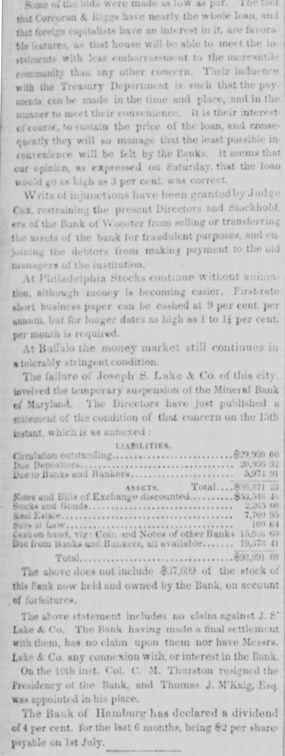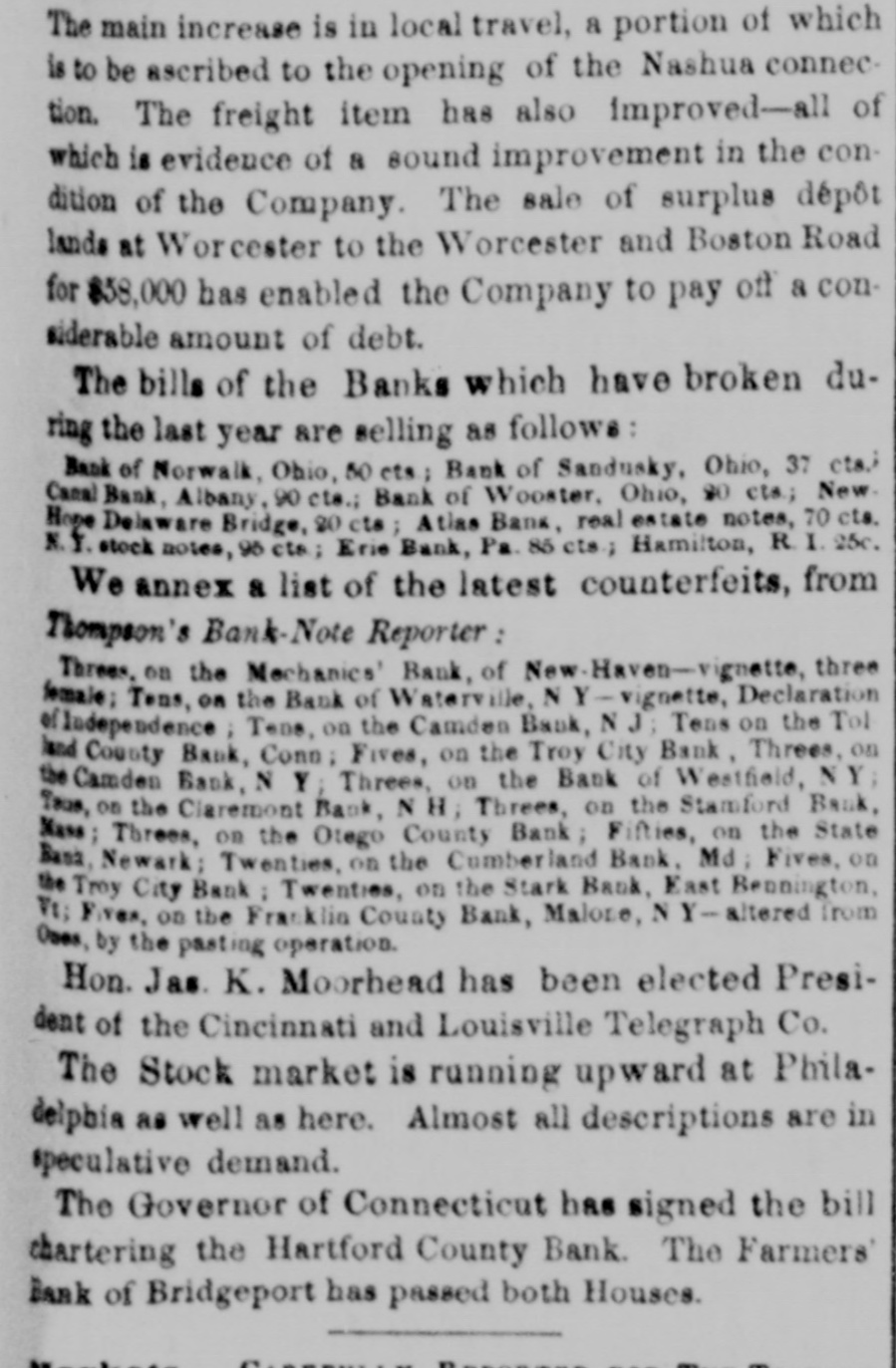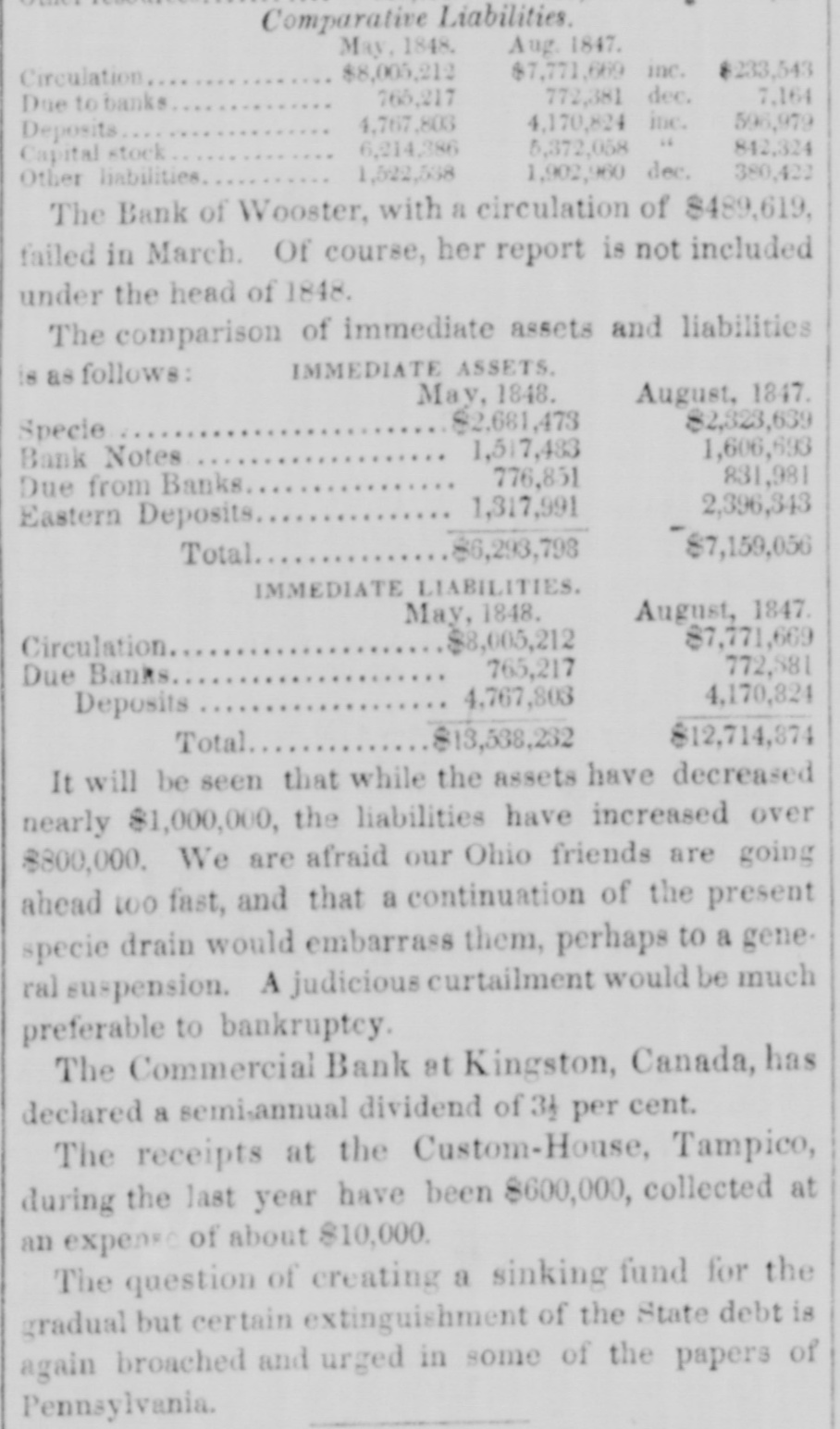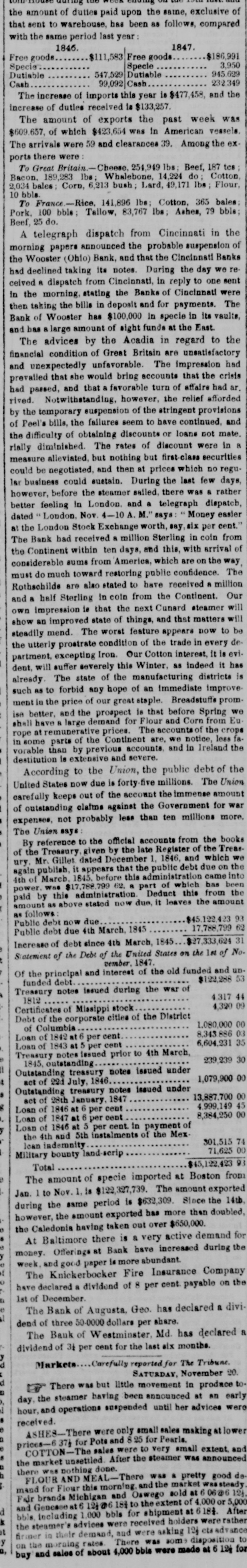 utting THE on STATE AUTH the amount of duties paid upon the same, exclusive of that sent to warehouse, has been as follows, compared with the same period last year 1847. 1846. $186,991 Free goods $111,583 Free goods 3,950 Specie Species. 945.629 Dutiable 547,529 Dutiable 232.349 Cash 99,092 Cash The increase of imports this year is $477,458, and the increase of duties received is $133,257. The amount of exports the past week was $609.657, of which $423,654 was in American vessels The arrivals were 59 and clearances 39. Among the ex. ports there were To Great Cheese, 254,949 lbs: Beef, 187 tcs Bacon. 189,283 lbs Whalebone, 14,224 do: Cotton 2,034 bales Corn, 6,213 bush; Lard, 49,171 lbs Flour, 10 bbls. To France Rice, 141,896 lbs: Cotton. 365 bales Pork, 100 bble Tallow, 83,767 lbs; Ashes, 79 bble; Beef, 25 do. A telegraph dispatch from Cincinnati in the morning papers announced the probable suspension of the Wooster (Ohio) Bank, and that the Cincinnati Banks had declined taking its notes. During the day we received A dispatch from Cincinnati, in reply to one sent in the morning, stating the Banks of Cincinnati were then taking the bills in deposit and for payments. The Bank of Wooster has $100,000 in specie in its vaults, and has large amount of eight funds at the East. The advices by the Acadia in regard to the financial condition of Great Britain are unsatisfactory and unexpectedly unfavorable. The impression had prevailed that she would bring accounts that the crisis had passed, and that a favorable turn of affairs had ar. rived. Notwithstanding, however, the relief afforded by the temporary suspension of the stringent provisions of Peel's bills, the failures seem to have continued. and the difficulty of obtaining discounts or loans not mate. rially diminished. The rates of discount were in 8 measure alleviated, but nothing but first-class securities could be negotiated, and then at prices which no regu. lar business could sustain. During the last few days, however, before the steamer sailed, there was a rather better feeling In London. and a telegraph dispatch, dated London. Nov. 4-10 A M. says Money easier at the London Stock Exchange worth, say, six per cent. The Bank had received a million Sterling in coin from the Continent within ten days, and this, with arrival of considerable sums from America, which are on the way must do much toward restoring public confidence. The Rothschilds are also stated to have received A million and a half Sterling in coin from the Continent. Our own impression is that the next Cunard steamer will show an improved state of things, and that matters will steadily mend. The worst feature appears now to be the utterly prostrate condition of the trade in every department, excepting Iron. Our Cotton interest, it is evident. will suffer severely this Winter. as indeed it has already The state of the manufacturing districts is such as to forbid any hope of an Immediate improve ment in the price of our great staple. Breadstuffe promise better. and the prospect is that before Spring we shall have large demand for Flour and Corn from Eu rope at remunerative prices. The accounts of the crops in some parts of the Continent are, we notice, less fa. vorable than by previous accounts. and in Ireland the destitution is extensive and severe. According to the Union, the public debt of the United States now due is forty-five millions. The Union carefully keeps out of the account the immense amount of outstanding claims against the Government for war expenses, not probably less than ten millions more, The Union says By reference to the official accounts from the books of the Treasury. given by the late Register of the Treas. ury. Mr. Gillet dated December 1, 1846. and which we again publish, it appears that the public debt due on the 4th of Marcb. 1845. before this administration came into power. was $17,788.79 62, a part of which has been paid by this administration Deduct this from the amount as above stated now due, it leaves the amount follows: as $45,122,423 93 Public debt now due 62 17,788,799 6 Public debt due 4th March, 1845 Increase of debt since 4th March, 1845 $27,333,624 31 S latement of the Debt of the United States on the 1st of No. vember. 1847. Of the principal and interest of the old funded and un. 53 $122,288 funded debt. Treasury notes issued during the war of 4.317 44 1812 4,320.09 Certificates of Missippi stock Debt of the corporate cities of the District 1.080.000 00 of Columbia 8,343,886 03 Loan of 1842 at per cent 6,604,231 35 Loan of 1843 at per cent Treasury notes issued prior to 4th March, 239,239 3 30 1845. outstanding Outstanding treasury notes issued under 1,079,900 00 act of 22d July, 1846 Outstanding treasury notes issued under 13,887,700 00 act of 28th January, 1847 4.999.149 4 45 Loan of 1846 at 6 per cent 8,384,250 00 Loan of 1847 at 6 percent Loan of 1846 at 5 per cent. in payment of the 4th and 5th instalments of the Mex. 301,515 74 loan indemnity 71,625 00 Military bounty land-scrip $45,122,423 93 Total The amount of specie imported at Boston from Jan. 1 to Nov. 1. is $122,327,739. The amount exported during the same period is $632,309. Since the 14th however, the amount exported has more then doubled. the Caledonia having taken out over $650,000. At Baltimore there is a very active demand for money. Offerings at Bank have increased during the week. and good paper is more abundant The Knickerbocker Fire Insurance Company have declared a dividend of 8 per cent payable on the 1st of December The Bank of Augusta, Geo. has declared a dividend of three 50-0000 dollare per share. The Bank of Westminster. Md. has declared a dividend of 3 per cent for the last six months. y Markets Carefully reported for The Tribune. SATURDAY, November 20. d E There was but little movement in produce to. D day, the steamer having been announced at an early N hour. and operations suspended until her advices were received ASHES There were only small sales makin