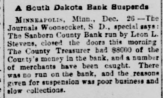 Two small children of Victor Rodgers. of Jesseville, Mich., were burned to death while alone in their home the other day. AT a Christmas entertainment at a church at Nabb'sstation near Jeffersonville, Ind., Joseph Taftinger and Bud Robinson were probably fatally wounded. The fight sprang up in the rear of the room while the programme of the Sunday school was being carried out. FRANK E. DICKINSON and Minnie Brundage fell through the ice while skating on a mill pond near Ann Arbor, Mich. Both were students at the Michigan University. AT East Chicago, Ind., Christmas morning, while a masquerade party was in full blast at the Tod Opera House, a fire broke out, creating a terrible panic. Fortunately no one was seriously hurt. THE large dry goods firm of Henry R. Heman & Co., Council Bluffs, Iowa, has suspended. The assets are reported at $300,000; liabilities, $200,000. THE wife of General Fremont was presented with a Christmas gift in the shape of the lovely cottage in which she lives, as a token of affection from a number of women of California, headed by Mrs. Senator Hearst, who raised $10,000 purchase money. LINDEMANN'S building with other property at Viroqua, Wis., was consumed by fire, involving a loss of $150,000; insurance only $16,000. THE Sanborn County Bank at Woonsocket, S. D., has suspended because of poor business. Leon L. Stevens, the city treasurer, was the owner. The county had $8,000 in the bank. THE Ohio Oil Company, a branch of the Standard Oil Company, has increased its capital stock from $3,500,000 to $8,000,000. A REPORT from Pine Ridge Agency says that after a council in the Bad Lands the Indians had resolved to surrender. THE 600 employes of the Pullman works of Chicago have been notified of a reduction of ten per cent. in wages. GUSTAV LARSON, a laborer, lost himself in one of the big sewers of Minneapolis and wandered three miles before he could get out. He was badly poisoned. FIRE in Weyaumega, Wis., the other morning caused the death of Orrin Ennis and did much damage. THE SOUTH. THE sugar house on Cartwright Eustis' fusilier plantation in Louisiana burned. Loss, $100,000; insurance, $50,000. GENERAL SPINNER, ex-Treasurer of the United States, is slowly dying at Jacksonville, Fla. THE schooner Mary Ellen, from Salisbury, Md., for Baltimore, is reported lost, together with her crew of five men -Captain Henry Wheatley and son, William Abbott and son and Saul Gale. CHATTANOOGA, Tenn., iron men claim that good tin-plate has been made from basic steel made in Chattanooga. A SPECIAL from Petersburg, Va., says it is reported that the five negroes who were arrested for the murder of Dr. E. H. Riggin, in Mecklenbourg County, and committed, were taken from jail and lynched. SAN AUGUSTINE, Tex., has been seriously damaged by fire. IN a row at Chilesburg, Ky., a tough named James Parlin from Jacks creek was killed. Two or three others were injured during the fusilade of over 100 shots. FOREPAUGH'S Theater and the Masonic Temple, Baltimore, were destroyed by fire Christmas day. The loss was heavy. THE Savannah (Ga.) Fire & Marine Insurance Company has wound up its affairs. Threatened adverse legislation was the principal cause of closing up the business. THE Edisto phosphate and fertilizer works about three miles from Charleston, C., were burned the other night. The loss was about $200,000, fully covered by insurance. THE Maverick bank, of San Antonio, Tex., closed its doors after a heavy run that lasted three weeks. Sam Maverick, sole owner of the bank and its business, has made an assignment of all his property, real and personal, to Reagan Houston. The liabilities amount to $844,164, and the assets are estimated at $1,780,915. IN a saloon row in Birmingham, Ala., George Kelly and Jack Lynch, railroad men, were fatally stabbed. W. D. SIMPSON. Chief Justice of the Supreme Court of South Carolina, is dead. By an explosion of a boiler at Kelly & Wells' lumber mill on Black river, forty miles from Newport, Ark., two men were killed. Another man and a woman were severely injured. GENERAL.