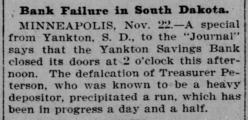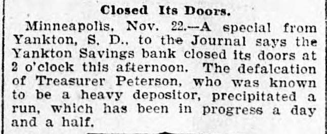 Bank Closes Its Doors. Minneapolis, Minn., Nov. 22.-A special from Yankton, S.D., to the Journal says the Yankton Savings bank closed its doors at 2 o'clock this afternoon. The defalcation of Treasurer Peterson, who was known to be a heavy depositor, precipitated a run which has been in progress a day and a half.