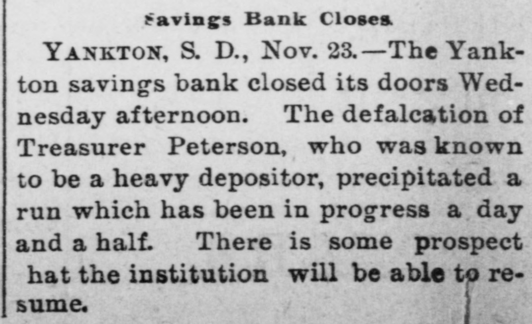 Minneapolis, Minn., Nov. 22.-A special from Yankton, S. D., to the Journal says the Yankton Savings bank closed its doors at 2 o'clock this afternoon. The defalcation of Treasurer Peterson, who was known to be a heavy depositor, precipitated a run which has been in progress a day and a half.