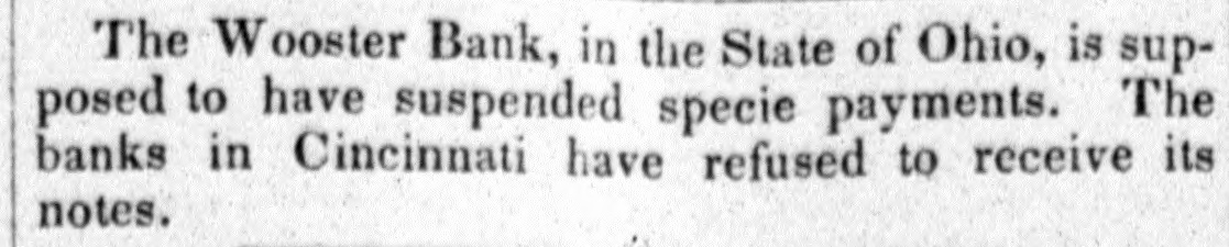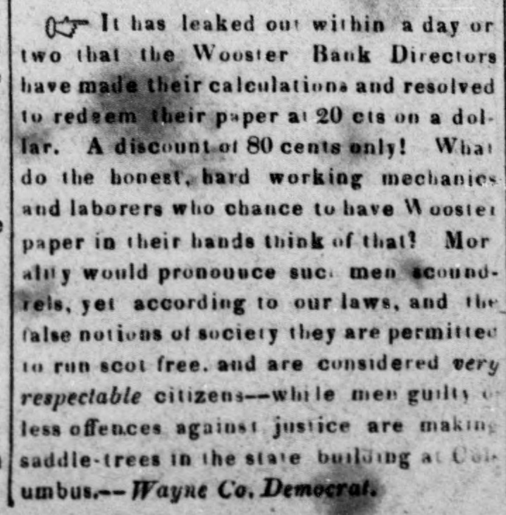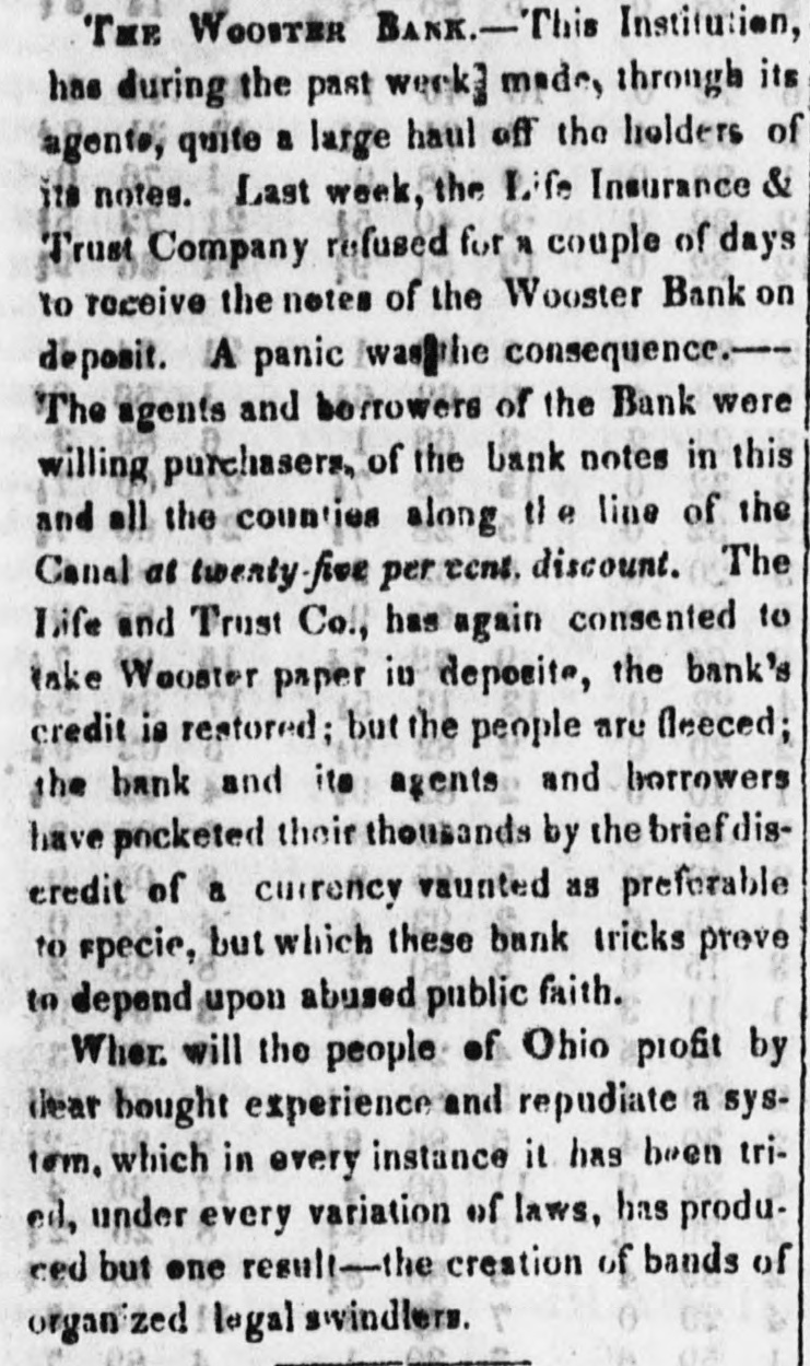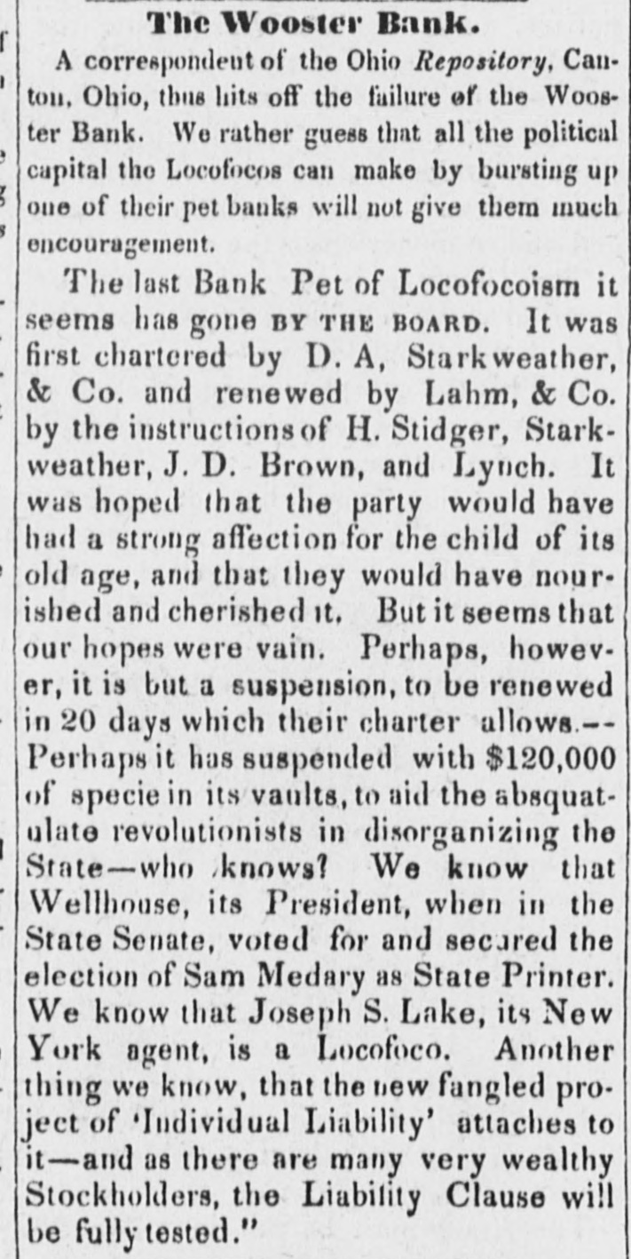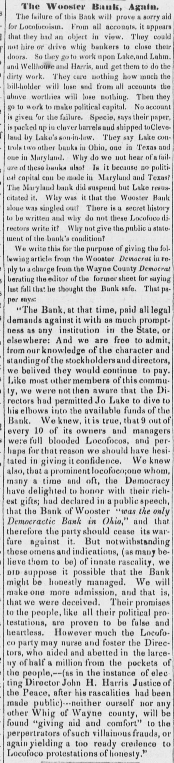 Bank. Wooster of The Monday Statesman publishes H. from JOHN of the the of one Wooster directors view which partial presents that Acinstitution. to stock paid of who the bank, condition this, of the which capital $171,900 is the is of head His curding in is $249,450; S. LAKE, house in New his York, partner O. the latter held by the JOSEPH late failing in business is be Kleum, He has not bank. in the discharge son-in-law, cashier of the however, of but late. has been at brokerage conducting of the The ing been engage hese of duties, business bank business been for has, years, conducClevelandeveral their ted agenthrough almost entirely on the with little part cies, wledge, to as its Mr. the of details; directors to its for use funds KLENN of on the and east, professing the purchase to for Mr. lake collectheir tion. accounts and which following remitting Both them rendered nppeared to be extract fair at bank presents of the time stoppage. all satisfactory. regularly condition The of the It cuts of at that any hope once considerable its by creditors, mount of it modern while picture presents the that whole stamps system banking and worthless fraudulent. utlerly on the of the bank evebooks exthe to suspensions and ning The previous the Directors to she wed in the that its its lia- ashibited weekly statement, 10 $768,729, capital stock, bilities, seis amounted inclusive fund, profits of the of and which unclaimed $462, dividends, contingen was in to circulation, $492,403; and of the the in balance specie, assets of bills they principally 223 showed notes deposites. $92,560 other to and banks; be $415, of J. ex- S. and 291 the in bills $89,759 discounted $50,428 deposited deposited with in state with & and into change; o. Lake Kiemm $19,244 Co.; & Co.; in real $57,685 estate, items the miscellaneouscount; have stocks; in those bank been to able of the balance that usually what enter investigation amount the of the assets J. S. of Co. Like hands but from make, 1 find bank that actually and in O. at of the & Co. time their fail. Klemm of was ure about consisting $540,000, to them items above charged the state stocks deposites, &C.: as bills of exchange, of the bank of a little of items above specie the spectively of the bank, under the control consisting notes of and real estate leaving ove: $200,000, and miscellabills payable other the nies; and banks, bank, the a balance portion but of of as which to what are bad mount, in will arise or at the doubtful ain debts; not advised. naturally Mr. Lake the public Mr. have and Klemm of The enquiry mind, as to what done with so the assets. bank's In would say, reply that they acknowledge in the last year produce large an amount to this inquiry the loss operations, of $150, into with went they since which 000 I presume and that am informed with its means its funds; explosion. that it up was the Branch Bank Banks in the Mr. Lake got Tuledo, and a Bank Akron Bank that in and and purchased the the Canal Mineral has of become of his Texas, of Maryland, the and stock worthless in all of in which conse- other quence the Clevelandearly failure. Of what and note stockholders the been made time speculation of the bank have yet unadvised; but holders we are as them. and victims, will perhaps develop that will be saved As to the wrecks amounts of the two liabilities firms, of from the liquidating the the directors applied 10 Mr. HARRIS says In private note accompanying have the bank, no knowledge. his communication munication from Mr. he information is of the most says: although indefinite, We fear that he negotiaLake, gloomy has spent last character. the bill last of gollar, the bank and in his publish posa the es letter session, ted the to save himself." of Tuesday dated on from 15th instant, The Statesman from Wooster, which we extract What does paragraph. Is the specie sent to at that place? the this following. movement Cleveland, mean? to sustain the assowagon to is ciate The bank Woster bank Cleveland seni two night now beloads of specie This is true! and It no secret, that stand son-in-law, It is now certain fore ascertained last. Jos. S. to Lake be indebted and fact, O. 10 Klemm. the that bank the his $677,000. is than the worse Bank failure German of Wooster." The Aus Freedom of the Press in