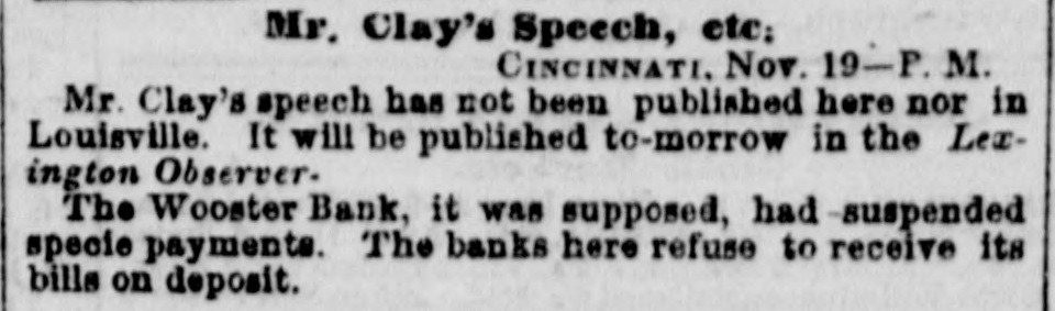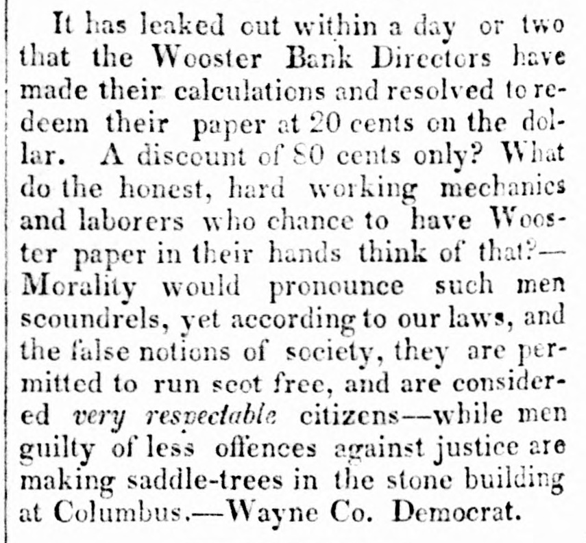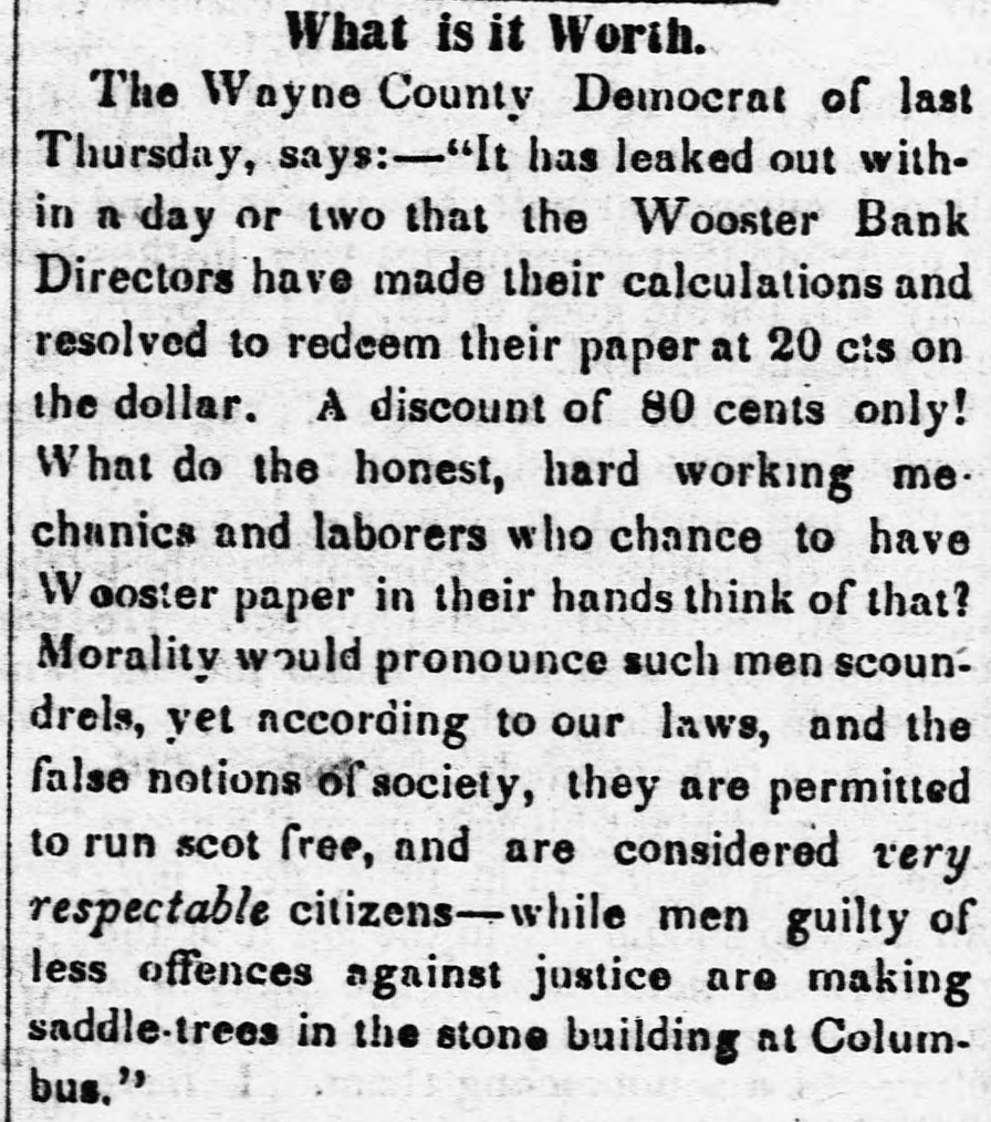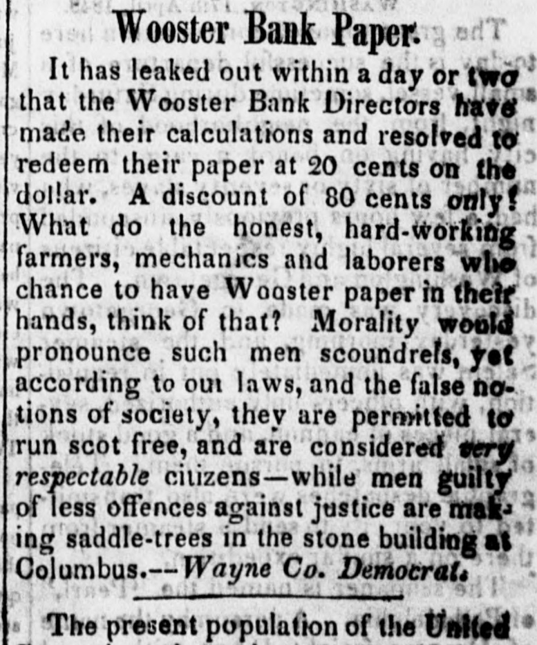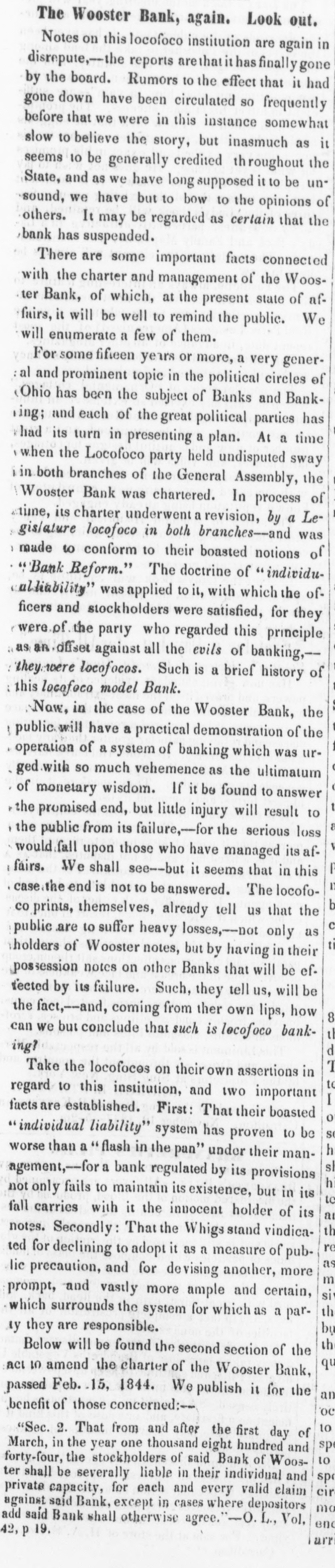 Bank. Wooster of The Monday Statesman publishes H. from JOHN of the the of one Wooster directors view which partial presents that Acinstitution. to stock paid of who the bank, condition this, of the which capital $171,900 is the is of head His curding in is $249,450; S. LAKE, house in New his York, partner O. the latter held by the JOSEPH late failing in business is be Kleum, He has not bank. in the discharge son-in-law, cashier of the however, of but late. has been at brokerage conducting of the The ing been engage hese of duties, business bank business been for has, years, conducClevelandeveral their ted agenthrough almost entirely on the with little part cies, wledge, to as its Mr. the of details; directors to its for use funds KLENN of on the and east, professing the purchase to for Mr. lake collectheir tion. accounts and which following remitting Both them rendered nppeared to be extract fair at bank presents of the time stoppage. all satisfactory. regularly condition The of the It cuts of at that any hope once considerable its by creditors, mount of it modern while picture presents the that whole stamps system banking and worthless fraudulent. utlerly on the of the bank evebooks exthe to suspensions and ning The previous the Directors to she wed in the that its its lia- ashibited weekly statement, 10 $768,729, capital stock, bilities, seis amounted inclusive fund, profits of the of and which unclaimed $462, dividends, contingen was in to circulation, $492,403; and of the the in balance specie, assets of bills they principally 223 showed notes deposites. $92,560 other to and banks; be $415, of J. ex- S. and 291 the in bills $89,759 discounted $50,428 deposited deposited with in state with & and into change; o. Lake Kiemm $19,244 Co.; & Co.; in real $57,685 estate, items the miscellaneouscount; have stocks; in those bank been to able of the balance that usually what enter investigation amount the of the assets J. S. of Co. Like hands but from make, 1 find bank that actually and in O. at of the & Co. time their fail. Klemm of was ure about consisting $540,000, to them items above charged the state stocks deposites, &C.: as bills of exchange, of the bank of a little of items above specie the spectively of the bank, under the control consisting notes of and real estate leaving ove: $200,000, and miscellabills payable other the nies; and banks, bank, the a balance portion but of of as which to what are bad mount, in will arise or at the doubtful ain debts; not advised. naturally Mr. Lake the public Mr. have and Klemm of The enquiry mind, as to what done with so the assets. bank's In would say, reply that they acknowledge in the last year produce large an amount to this inquiry the loss operations, of $150, into with went they since which 000 I presume and that am informed with its means its funds; explosion. that it up was the Branch Bank Banks in the Mr. Lake got Tuledo, and a Bank Akron Bank that in and and purchased the the Canal Mineral has of become of his Texas, of Maryland, the and stock worthless in all of in which conse- other quence the Clevelandearly failure. Of what and note stockholders the been made time speculation of the bank have yet unadvised; but holders we are as them. and victims, will perhaps develop that will be saved As to the wrecks amounts of the two liabilities firms, of from the liquidating the the directors applied 10 Mr. HARRIS says In private note accompanying have the bank, no knowledge. his communication munication from Mr. he information is of the most says: although indefinite, We fear that he negotiaLake, gloomy has spent last character. the bill last of gollar, the bank and in his publish posa the es letter session, ted the to save himself." of Tuesday dated on from 15th instant, The Statesman from Wooster, which we extract What does paragraph. Is the specie sent to at that place? the this following. movement Cleveland, mean? to sustain the assowagon to is ciate The bank Woster bank Cleveland seni two night now beloads of specie This is true! and It no secret, that stand son-in-law, It is now certain fore ascertained last. Jos. S. to Lake be indebted and fact, O. 10 Klemm. the that bank the his $677,000. is than the worse Bank failure German of Wooster." The Aus Freedom of the Press in