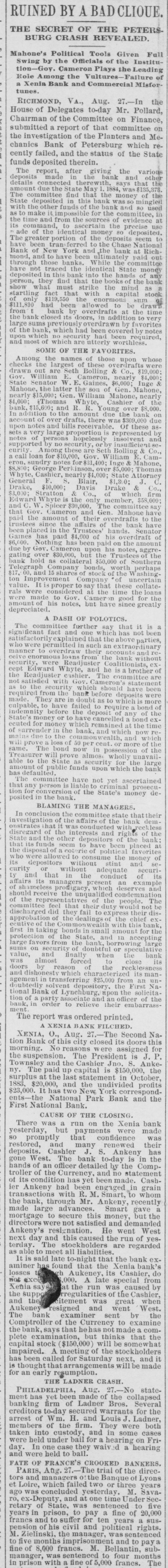 RUINED BY A BAD CLIQUE. THE SECRET OF THE PETER$ BURG CRASH REVEALED Mahone's Political Tools Given Full Swing by the Officials of the tion- Gov. Cameron Plays the Leading Role Among the Vultures- Failure a Xenia Bank and Commercial Misfo tunes. the RICHMOND, VA., Aug. 27 In House of Delegates to-day Mr Pollard, Chairman of the Committee on Finance submitted report of that committee the invest stigation of the Planters and Me chanics Bank of Petersburg which cently failed, and the status of the State funds deposited therein. after the The report was ordered printed. BANK O. XENIA, The Second Na city this tion Bank The and The the last surplus 1883. ided $20,000, profits $23,000. National Park Bank and the First National Bank CAUSE OF THE CLOSING There the was bank Xenia that so promptly and deposits. Cashier Ankeny gone West. The bank to-day hands an of officer detail the of troller the condition Ankeny with M bank through Mr. Smart made large mortgage this not and were satisfied directors demar He went Ankeny's West resignation. this and caused the run of yesThe day are regarded the bank that the bank not late special Xenia run was the of and The bank sent of Comptroller he has the bank thinks that plete 000 capital stock ($150, A the of impaired. meeting stockholder for Saturday is thought has called ements will be made sumption for an early resident THE ADNER CRASH Aug. state been has PHILADELE made of the Bros. to-day banking firm of Ladner rarrants for the arrest creditors Wm. H. and Louis Ladner, firm. were They of members the some and cases taken into under bail for heari on Fri one case day were held they wai d a hearing were held to bail. FRANCE'S and CROOKED BANKERS Atig PARIS FATE OF The trial of the direc and tors which failed conc and time Deputy retary State years in fine 20.000 of prison, pay suffer for ten years his pension civil and francs and to itical rights. and to M (inski the pay five months months imprisonn M. Bellantin, sub fine 8.000 francs. was sentenced to manager, The prison with 5,000
