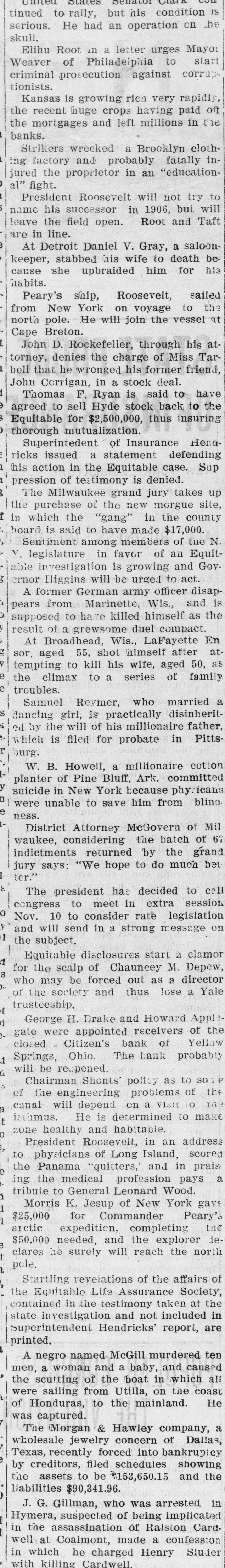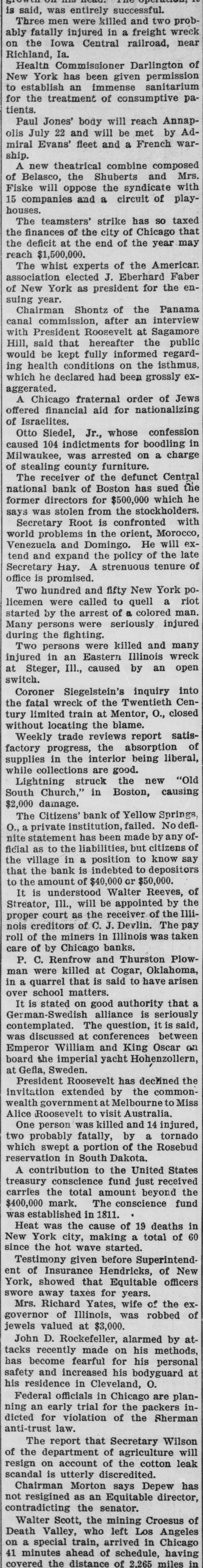 NEWS IN SHORT ORDER. The Latest Happenings Condensed for Rapid Reading. Domestic: It is said that the reason for Mayor Dunne's refusal to give out the report of the Scotch expert, Dalrymple, on the traction system of Chicago is due to the for "tainted money" for the Chicago without gloves. Another report confining itself to the traction problem has been asked for. Hitched to a plow by a rope, with the pastor holding the handles and Rev. L. K. Billingsley, of Wesley Methodist Church, steadying the beam, members of the First Methodist Episcopal Church, in Des Moines, broke ground for their new building. John Barrenberg was shot dead on the State rifle range at Sea Girt, N. J., Saturday afternoon. He ventured out of the rifle pit when there was some skirmish firing going on and a stray bullet struck him. Prof. A. N. Fox. who recently telegraphed to John D. Rockefeller begging for "tained money" for the Chicago Theological Seminary, has been dismissed from the faculty of that institution. Mrs. Janet Wilson, who fled from the Hudson River State Hospital and came to Bridgeport, Ct., with Walter Langdon, shot herself at the Washington Bridge Tavern and will probably die. Albert Nuley, of Fishers Landing, N. Y., brutally assaulted Mrs. Fanny Harners and her daughter, who caught him burglarizing their home in Clayton, N.Y. Dr. Charles A. Linsley, secretary of the Connecticut Board of Health, recommends isolation of the nurses and patients in cases of cerebro-spinal meningitis, Superintendent of Insurance Hendricks, of New York, gave out an answer to the criticisms of his official acts in connection with the Equitable investigation. The condition of Senator William A. Clark, of Montana, who underwent an operation for an abscess in the middle ear. was pronounced very satisfactory. The police of Brooklyn promise sensational developments in the case of Fredcrick C. Carlton, who is being held on the charge of poisoning his wife The unsecured claims against the estate of defaulting Banker Bigelow, amounting to nearly $2,000,000, will get only 10 cents on the dollar. The United States training ship Hartfort arrived at Newport, R. I., from with a detachment L. Gardiners Bay, of naval cadets. In Chicago a verdict of not guilty was announced by Judge A. H. Chetlain, of the Superior Court, in the case of President Albert A. G. Wheeler, of the Illinois Tunnel Company, and several former municipal officers on trial for alleged alteration of public records. The jury in the case was discharged. Twelve new directors of the Equitable Life Assurance Society were elected. Among them are former Judge D. Cody Herrick; President Butler, of Columbia University, and Congressman Littlefield, of Maine. Walter Scott, the gold miner of Death Valley, caused a sensation in the financial district of New York, his automobile hansom being followed by crowds that yelled to him to toss out his gold. Richard Wareham, the oldest member of the Knights of Pythias, died at Rock Island, III., aged 70 years. A New York man went to sleep on the roof of a house and fell five stories. He was fatally injured. Three persons were killed and seven injured in a collision between two railroad trains at Steiger, Ill. Near Braintree, Mass., a Pole murdered his wife by nearly severing her head from her body. Several men in New York became insane from the heat. One man who was overcome fell from a roof and fractured his skull. Heat and humidity are responsible for an epidemic of suicides in Utica, N. Y. Mabel Thurston, aged 16 years, was killed by lightning and Mrs. Martin Noan paralyzed during a storm in Williamsport, Pa. The Citizens' Bank of Yellow Springs, O., suspended payment and all business in the village was brought to a standstill. President Roosevelt has declined the invitation of the commonwealth governr ment of Australia to Miss Roosevelt. After a number of attempts at suicide P Pauline Muff. of Brooklyn, finally sucto ceeded by drinking carbolic acid. Herman Bartels died in Bay City, Mich., from lockjaw, the result of a Fourth of July accident. J. J. Jusserand, the French ambassador, and Mrs. Jusserand sailed from New P York for Havre. O In various towns of Wisconsin Indian girls are being employed as domestic servants. P Gen. Horace Porter returned to New York on the steamer Deutschland.