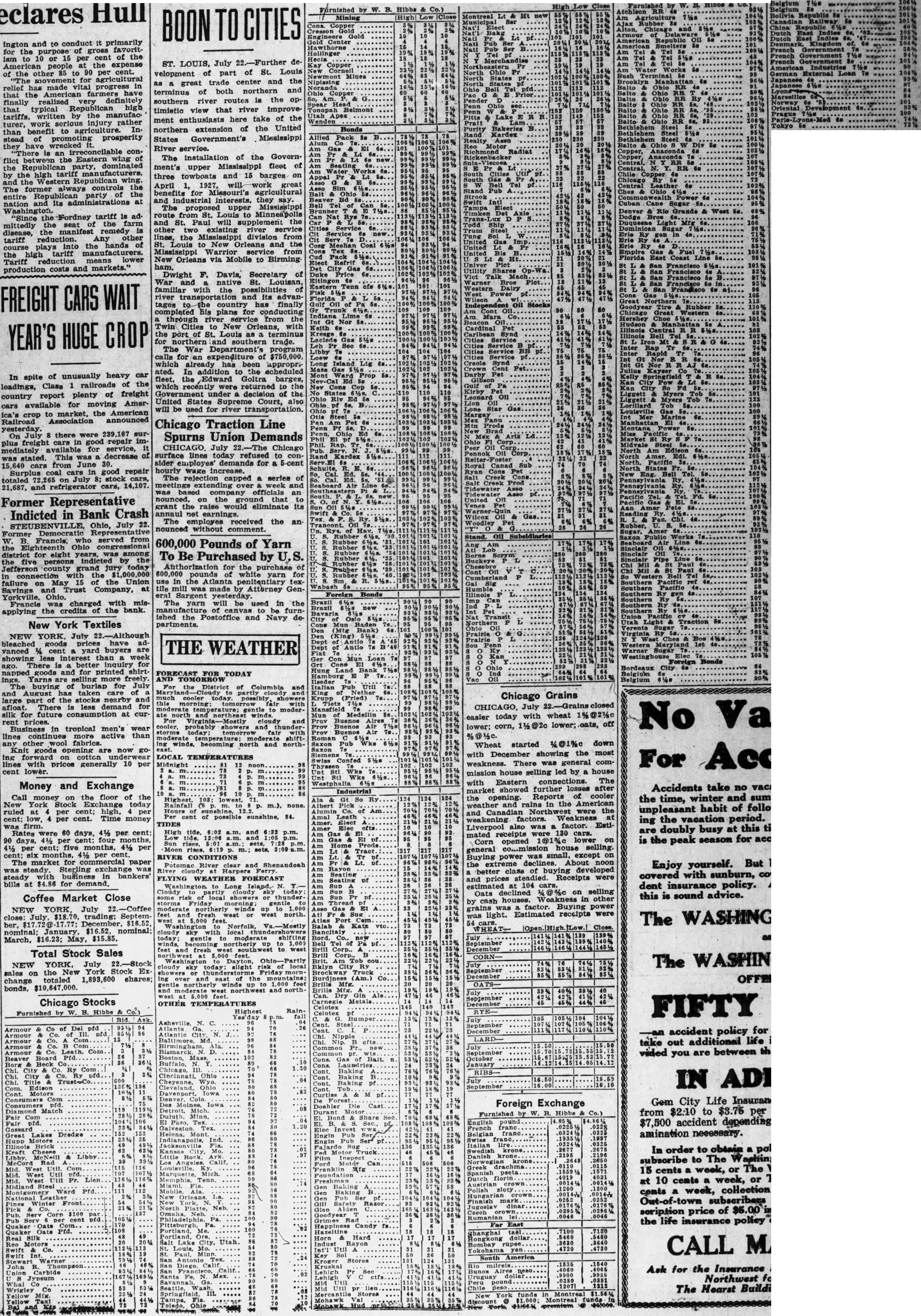 Furnished W. Hibbs & Furnished Ht Mining BOON TO CITIES ington and to conduct it primarily for the purpose of gross favoritism to 10 or 15 per cent of the ST. LOUIS, July 22.-Further deAmerican people at the expense Copper of the other 85 to 90 per cent. velopment of part of St. Louis Terminal "The for agricultural as a great trade center and the relief has made vital progress in terminus of both northern and that the American farmers have finally realized very definitely southern river routes is the opthat typical Republican high timistic view that river improvetariffs, written by the manufacment enthusiasts here take of the turer, work injury rather northern extension of the United than benefit to agriculture. Instead of promoting prosperity States Government's Mississippi Allied they have wrecked it. River service. is an irreconcilable conThe installation of the Governfliet between the Eastern wing of the Republican party, dominated ment's upper Mississippi fleet of by the high tariff manufacturers, three towboats and 15 barges on and the Western Republican wing. April 1, 1927, will work great The former always controls the benefits for Missouri's agricultural entire Republican party of the and industrial interests, they say. nation and its administrations at The proposed upper Mississippi Washington. route from St. Louis to Minneapolis "Since the Fordney tariff is adand St. Paul will supplement the mittedly the seat of the farm other two existing river service disease, the manifest remedy Service lines, the Mississippi division from tariff reduction. Any other St. Louis to New Orleans and the course plays into the hands Mississippi Warrior from the high tariff manufacturers. New Orleans via Mobile to Birming East Coast Tariff reduction means lower Refrif ham. Francisco production costs and markets." Dwight F. Davis, Secretary of War and native St. Louisan, familiar with possibilities of Dairy FREIGHT CARS WAIT river transportation and its advantages the country has finally completed his plans for conducting a through river service from the Twin Cities to New Orleans, with Central YEAR'S HUGE CROP the port of St. Louis as a terminus Kresge Laclede Service for northern and southern trade. The War Department's program Rapid calls for an expenditure of $750,000 which already has been appropriated. In addition to the scheduled In spite of unusually heavy car fleet. the Edward Goltra barges, loadings, Class 1 railroads of the which were returned to the country report plenty of freight Government under decision of the United States Supreme Court, also cars available for moving Amerwill be used for river transportation. Star ica's crop to market, the American Railroad Association announced Chicago Traction Line yesterday. On July there were 239,167 sur- Brad : Spurns Union Demands plus freight cars in good repair imCHICAGO. July 22.-The Chicago mediately available for service, surface lines today refused to conwas stated. This was decrease of sider employes' demands for a 5-cent E1 640 cars from June 30. Canad Surplus coal cars in good repair hourly wage increase. totaled 265 on July 8; stock cars, The rejection capped a series of meetings extending over week and 21,687, and refrigerator cars, 14,107. Tidewater was based company officials an nounced, on the that to Former Representative grant the raise would eliminate its Indicted in Bank Crash annaul net earnings. The employes received the an STEUBENVILLE, Ohio, July 22. nounced without comment. Former Democratic Representa Subsidiaries Rubber W. B. Francis. who served from 600,000 Pounds of Yarn the Eighteenth Ohio congressional district for eight years, was among To Be Purchased by U.S. five persons indicted by the Jefferson county grand jury today Authorization for the purchase of in with the $1,000,000 600,000 pounds of white yarn for failure on 15 of the Union use in the Atlanta penitentiary texSavings Trust Company, at tile mill was made by Attorney GenForeign Bonds Yorkville, Ohio. eral Sargent yesterday. Francis was charged with mis- The yarn will be used in the applying the credits of the bank. of to be furnished the Postoffice and Navy departments. 1st THE WEATHER Antio Elec Con Mun Loan Foreign Bonds Cons Bordeaux City FORECAST FOR TODAY TOMORROW Belgium For the District of Columbia and Pub Util partly (Fried) this morning: cooler possibly fair showers with Tietz moderate temperature; gentle to moder- Mansfield north and northeast Medellin For Virginia- Mostly winds. cloudy and Buenos cooler, probably showers and thunder- Buenos storms today: tomorrow fair Buenos moderate temperature shiftwinds, becoming north and north- Saxon Pub LOCAL TEMPERATURES Swiss Confed Midnight 12 noon Wks Wks 88% Industrial 103: Ala So 124 Ry Rainfall none. Albert Hours of Am Per cent of possible sunshine, 84. Leath TIDES Amer Elec ofts High tide, 6:02 a.m. and 6:32 Gas Low tide. a.m. and is the peak season for accidents. Sun rises, 7:28 rises. 6:19 m.; sets, 3:09 a.m. Lt Tract RIVER CONDITIONS Lt. Potomac clear and Shenandoah River Harpers FLYING WEATHER FORECAST Seating of Long Island, N. some Cloudy risk local showers cloudy or sky thunder today this is sound advice. storms moderate northerly up 1,000 feet fresh or north. at feet. Washington to Norfolk, Va.-Mostly Balab Katz cloudy with local Bancitaly today; gentle moderate shifting winds, becoming northerly up to 1,000 feet and fresh west southwest to west Corp.. feet. Washington Dayton, Ohio-Partly cloudy sky today: slight risk of local showers or Friday Truck Ing over the mountains: Burdiness (Am.) Co northerly winds up 1,000 feet moderate west northwest and northAle Chicago Stocks OTHER TEMPERATURES Furnished by B. Hibbs Co.) Highest RainC. Co of Del pfd Atlanta Ga. Armour & Atlantic City Armour & Com Md. Com Armour Armour & Co. Leath. Com Beaver Board Pfd. Beck City Ry Com Ry Title City Trust-Co. Cheyenne, 136 Edison Ohio Cont. Motors M Consumers Iowa Foreign Exchange Consumers pfd. Diamond Ma