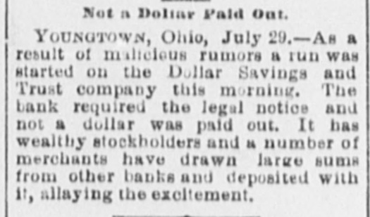 Not a Dollar Paid Out. YOUNGTOWN, Ohio, July 29.-As a result of malicieus rumors a run was started on the Dollar Savings and Trust company this morning. The bank required the legal notice and not a dollar was paid out. It has wealthy stockholders and 24 number of merchants have drawn large sums from other banks and deposited with it, allaying the excltement.