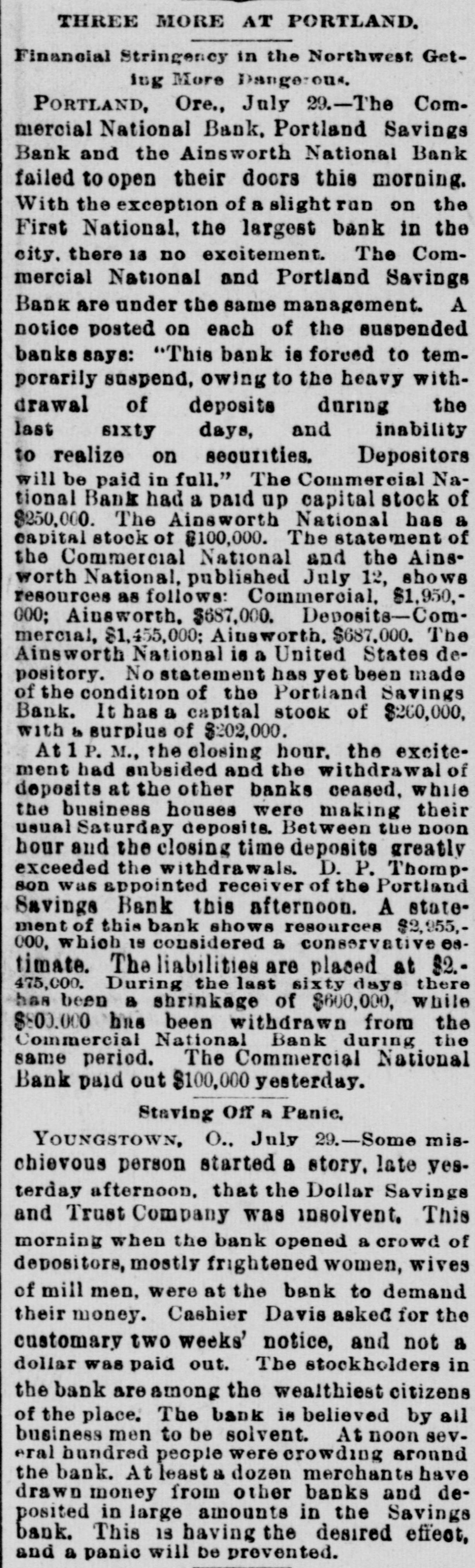 THREE MORE AT PORTLAND. Financial Stringency in the Northwest Geting More Dangerous. PORTLAND, Ore., July 29.-The Commercial National Bank, Portland Savings Bank and the Ainsworth National Bank failed to open their doors this morning. With the exception of a slight run on the First National, the largest bank in the city. there 13 no excitement. The Commercial National and Portland Savings Bank are under the same management. A notice posted on each of the suspended banks says: "This bank is forced to temporarily suspend, owing to the heavy withdrawal of deposite during the last sixty days, and inability to realize on securities. Depositors will be paid in full." The Commercial National Bank had a paid up capital stock of $250,000. The Ainsworth National has a capital stock of @100,000. The statement of the Commercial National and the Ainsworth National, published July 12, shows resources as follows: Commercial, $1,950,000; Ainsworth. $687,000. Deposits-Commercial, $1,455,000; Ainsworth, $687,000. The Ainsworth National is a United States depository. No statement has yet been made of the condition of the Portland Savings Bank. It has a capital stook of $200,000, with is surplus of $202,000. At 1 P. M., the closing hour. the excitement had subsided and the withdrawal of deposits at the other banks ceased. while the business houses were making their usual Saturday deposits. Between the noon hour and the closing time deposits greatly exceeded the withdrawals. D. P. Thompson was appointed receiver of the Portland Savings Bank this afternoon. A statement of this bank shows resources $2,955,000, which 18 considered & conservative estimate. The liabilities are placed at $2. 475,000. During the last sixty days there has been a shrinkage of $600,000, while $80.000 has been withdrawn from the Commercial National Bank during the same period. The Commercial National Bank paid out $100,000 yesterday. Staving Off a Panic, YOUNGSTOWN, O., July 29.-Some mischievous person started a story, late yesterday afternoon. that the Dollar Savings and Trust Company was insolvent. This morning when the bank opened a crowd of depositors, mostly frightened women, wives of mill men, were at the bank to demand their money. Cashier Davis asked for the customary two weeks' notice, and not a dollar was paid out. The stockholders in the bank areamong the wealthiest citizens of the place. The bank is believed by all business men to be solvent. At noon several hundred people were crowding around the bank. At least a dozen merchants have drawn money from other banks and deposited in large amounts in the Savings bank. This 18 having the desired effect, and a panic will be prevented.