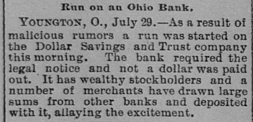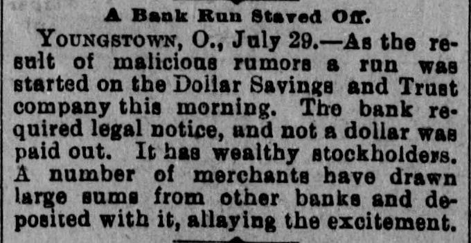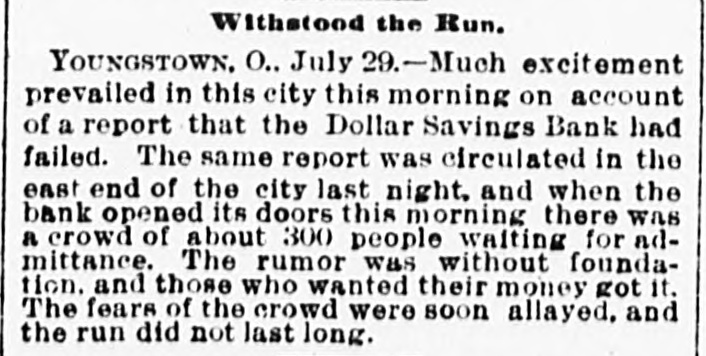 Malicious rumors circulated that the Dollar Savings & Trust Company was insolvent, prompting depositors to demand funds.