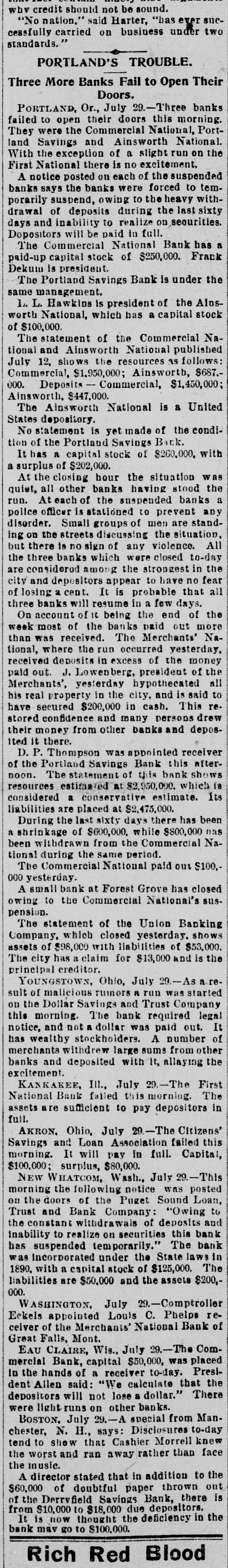 whv credit should not be sound. "No nation." said Harter, "bas ever successfully carried on business under two standards. PORTLAND'S TROUBLE. Three More Banks Fail to Open Their Doors. PORTLAND, Or., July 29.-Three banks failed to open their doors this morning. They were the Commercial National, Portland Savings and Ainsworth National. With the exception of a slight run on the First National there is no excitement. A notice posted on each of the suspended banks says the banks were forced to temporarily suspend, owing to the heavy withdrawal of deposits during the last sixty days and inability to realize on seourities. Dopositors will be paid in full. The Commercial National Bank has a paid-up capital stock of $250,000. Frank Dekum is president. The Portland Savings Bank is under the same management. L. L. Hawkins is president of the Alosworth National, which has a capital stock of $100,000. The statement of the Commercial National and Ainsworth National published July 12, shows the resources as follows: Commercial, $1,950,000; Ainsworth, $687.000. Deposits Commercial, $1,450,000; Ainsworth, $447,000. The Ainsworth National is a United States depository. No statement is yet made of the condition of the Portland Savings Bank. It has a capital stock of $260.000. with a surplus of $202,000. At the closing hour the situation was quiet, all other banks having stood the run. At each of the suspended banks a police officer is stationed to prevent any disorder. Small groups of men are standing on the streets discussing the situation, but there is no sign of any violence. All the three banks which were closed to-day are considered among the strongest in the city and depositors appear to have no fear of losing a cent. It is probable that all three banks will resume in a few days. On account of it being the end of the week most of the banks paid out more than was received. The Merchants' National, where the run occurred yesterday, received deposits in excess of the money paid out. J. Lowenberg, president of the Merchants', yesterday hypothecated all his real property in the city, and is said to have secured $200,000 in cash. This restored confidence and many persons drew their money from other banks and deposited it there. D. P. Thompson was appointed receiver of the Portland Savings Bank this afternoon. The statement of this bank shows resources estimated at $2,950,000. which 18 considered a conservative estimate. Its liabilities are placed at $2,475,000. During the last sixty days there has been a shrinkage of $600,000. while $800,000 has been withdrawn from the Commercial National during the same period. The Commercial National paid out $100,000 yesterday. A small bank at Forest Grove has closed owing to the Commercial National's suspension. The statement of the Union Banking Company, which closed yesterday. shows assets of $98,000 with liabilities of $53,000. The city has a claim for $13,000 and is the principal creditor. YOUNGSTOWN, Ohio, July 29.-As a.result of malicious rumors 8 run was started on the Dollar Savings and Trust Company this morning. The bank required legal notice, and not a dollar was paid out. It has wealthy stockholders. A number of merchants withdrew large sums from other banks and deposited with it, allaying the excitement. KANKAKEE, III., July 29.-The First National Bank failed this morning. The assets are sufficient to pay depositors in full. AKRON. Ohio, July 29-The Citizens' Savings and Loan Association failed this morning. It will pay in full. Capital, $100,000; surplus, $80,000. NEW WHATCOM, Wash., July 29.-This morning the following notice was posted on the doors of the Puget Sound Loan, Trust and Bank Company: "Owing to the constant withdrawals of deposits and inability to realize on securities this bank has suspended temporarily." The bank was incorporated under the State laws In 1890. with a capital stock of $125,000. The liabilities are $50,000 and the assets $200,000. WASHINGTON, July 29.-Comptroller Eckels appointed Louis C. Phelps receiver of the Merchants' National Bank of Great Falls, Mont. EAU CLAIRE, Wis., July 29.-The Commercial Bank, capital $50,000, was placed in the hands of a receiver to-day. President Allen said: "We calculate that the depositors will not lose a dollar." There were light runs on other banks. BOSTON. July 29.-A special from Manchester, N. H., says: Disclosures to-day tend to show that Cashier Morrell knew the worst and ran away rather than face the music. A director stated that in addition to the $60,000 of doubtful paper thrown out of the Derryfield Savings Bank, there is from $10,000 to $18,000 due depositors. It is now thought the deficiency in the bank mav go to $100,000. Rich Red Blood