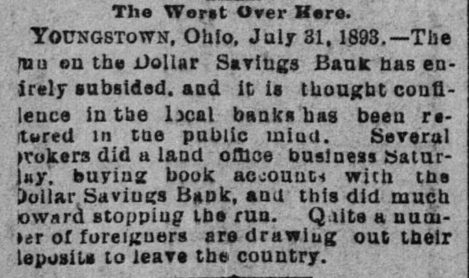 The Worst Over Here. YOUNGSTOWN, Ohio, July 31, 1893.-The mu on the Dollar Savings Bank has enirely subsided. and it is thought confilence in the local banks has been reSeveral tured in the public mind. rokers did a land office business Saturlay. buying book accounts with the Dollar Savings Bank, and this did much loward stopping the run. Quite a numDer of foreigners are drawing out their leposits to leave the country.