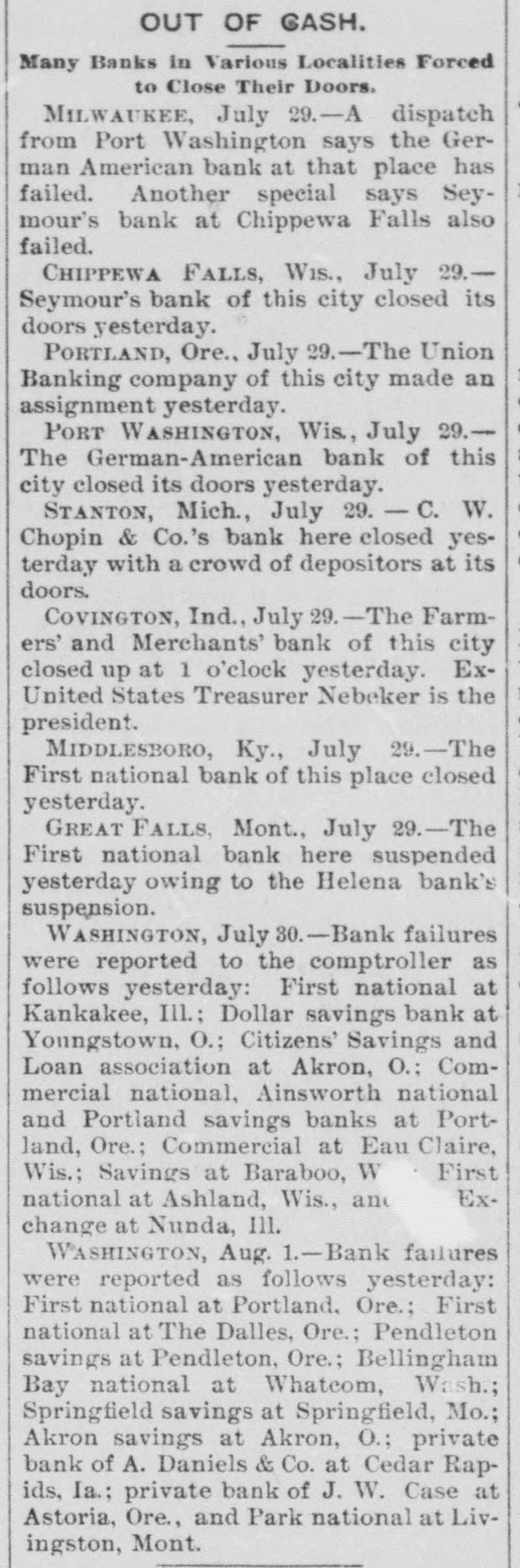 OUT OF CASH. Many Banks in Various Localities Forced to Close Their Doors. Milwaukee, July 29.-A dispatch from Port Washington says the German American bank at that place has failed. Another special says Seymour's bank at Chippewa Falls also failed. CHIPPEWA FALLS, Wis., July 29.Seymour's bank of this city closed its doors yesterday. PORTLAND, Ore., July 29.-The Union Banking company of this city made an assignment yesterday. PORT WASHINGTON, Wis., July 29.-The German-American bank of this city closed its doors yesterday. STANTON, Mich., July 29. - C. W. Chopin & Co.'s bank here closed yesterday with a crowd of depositors at its doors. COVINGTON, Ind., July 29.-The Farmers' and Merchants' bank of this city closed up at 1 o'clock yesterday. ExUnited States Treasurer Nebeker is the president. MIDDLESBORO, Ky., July 29.-The First national bank of this place closed yesterday. GREAT FALLS, Mont., July 29.-The First national bank here suspended yesterday owing to the Helena bank's suspension. WASHINGTON, July 30.-Bank failures were reported to the comptroller as follows yesterday: First national at Kankakee, Ill.; Dollar savings bank at Youngstown, O.; Citizens' Savings and Loan association at Akron, O.; Commercial national, Ainsworth national and Portland savings banks at Portland, Ore.; Commercial at Eau Claire, First Wis.; Savings at Baraboo, W Exnational at Ashland, Wis., and change at Nunda, 111. WASHINGTON, Aug. 1.-Bank failures were reported as follows yesterday: First national at Portland, Ore.; First national at The Dalles, Ore.; Pendleton savings at Pendleton, Ore.; Bellingham Bay national at Whatcom, Wash.; Springfield savings at Springfield, Mo.; Akron savings at Akron, 0.; private bank of A. Daniels & Co. at Cedar Rapids, Ia.; private bank of J. W. Case at Astoria, Ore., and Park national at Livingston, Mont.