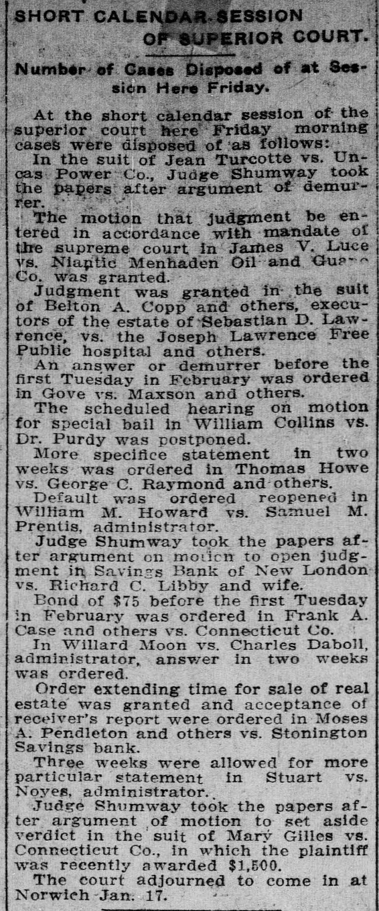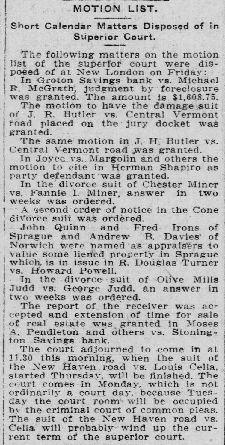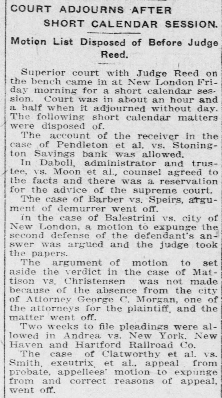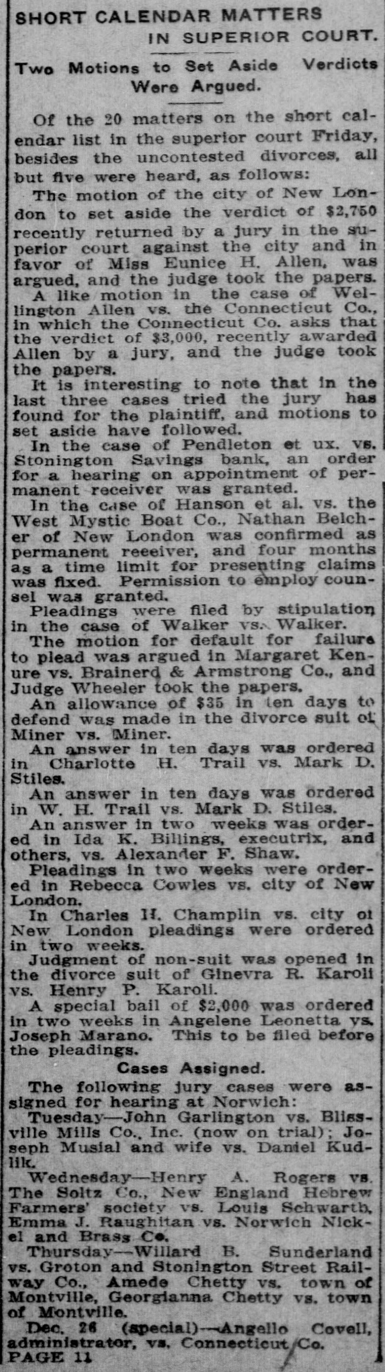 SHORT CALENDAR MATTERS IN SUPERIOR COURT. Two Motions to Set Aside Verdicts Were Argued. Of the 20 matters on the short calendar list in the superior court Friday, besides the uncontested divorces, all but five were heard, as follows: The motion of the city of New London to set aside the verdict of $2,750 recently returned by a jury in the superior court against the city and in favor of Miss Eunice H. Allen, was argued, and the judge took the papers. A like motion in the case of Wellington Allen vs. the Connecticut Co., in which the Connecticut Co. asks that the verdict of $3,000, recently awarded Allen by a jury, and the judge took the papers. It is interesting to note that in the last three cases tried the jury has found for the plaintiff, and motions to set aside have followed. In the case of Pendleton et ux. VS. Stonington Savings bank, an order for a hearing on appointment of permanent receiver was granted. In the case of Hanson et al. vs. the West Mystic Boat Co., Nathan Belcher of New London was confirmed as permanent receiver, and four months as a time limit for presenting claims was fixed. Permission to employ counsel was granted. Pleadings were filed by stipulation in the case of Walker VSA Walker. The motion for default for failure to plead was argued in Margaret Kenure vs. Brainerd & Armstrong Co., and Judge Wheeler took the papers. An allowance of $35 in ten days to defend was made in the divorce suit of Miner vs. Miner. An answer in ten days was ordered in Charlotte H. Trail vs. Mark D. Stiles. An answer in ten days was ordered in W. H. Trail VS. Mark D. Stiles. An answer in two weeks was ordered in Ida K. Billings, executrix, and others, vs. Alexander F. Shaw. Pleadings in two weeks were ordered in Rebecca Cowles vs. city of New London. In Charles II. Champlin vs. city of New London pleadings were ordered in two weeks. Judgment of non-suit was opened in the divorce suit of Ginevra R. Karoli vs. Henry P. Karoli. A special bail of $2,000 was ordered in two weeks in Angelene Leonetta ys. Joseph Marano. This to be filed before the pleadings. Cases Assigned. The following jury cases were assigned for hearing at Norwich: Tuesday-John Garlington vs. Blissville Mills Co., Inc. (now on trial); Joseph Musial and wife vs. Daniel Kudlik. Wednesday-Henry A. Rogers VS. The Soltz Co., New England Hebrew Farmers' society VS. Louis Schwarth, Emma J. Raughitan VS. Norwich Nickel and Brass Co. Thursday-Willard B. Sunderland vs. Groton and Stonington Street Railway Co., Amede Chetty vs. town of Montville, Georgianna Chetty vs. town of Montville. Dec. 26 (special)-Angello Covell, administrator, vs, Connecticut Co. PAGE 11