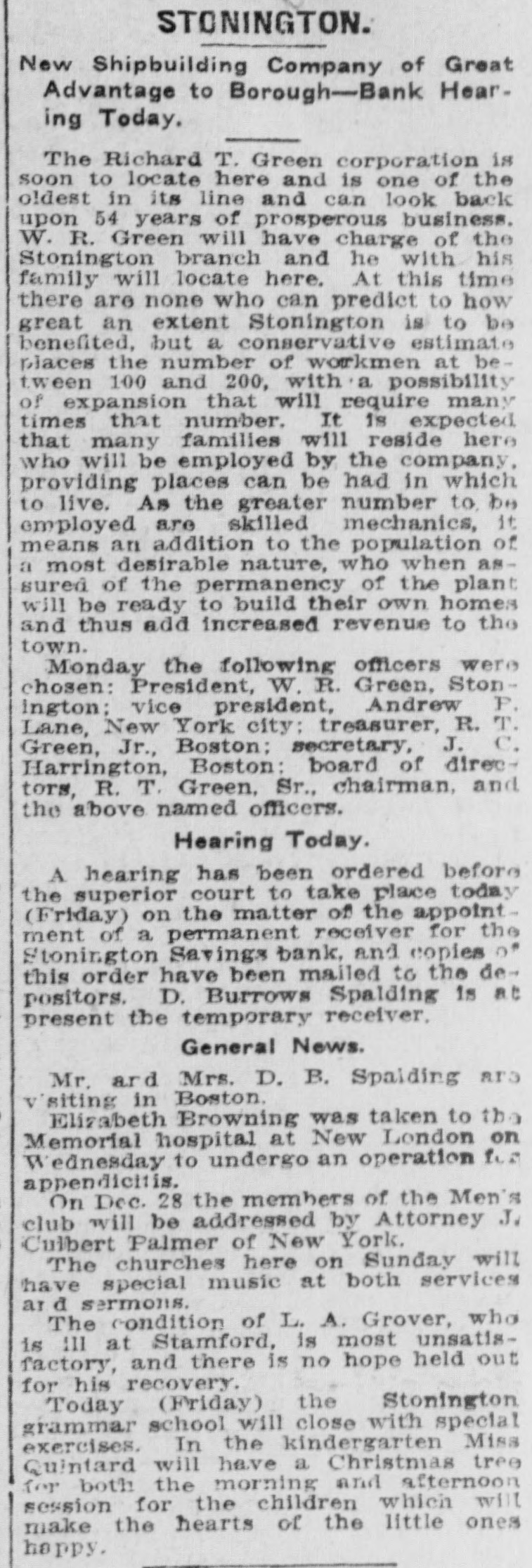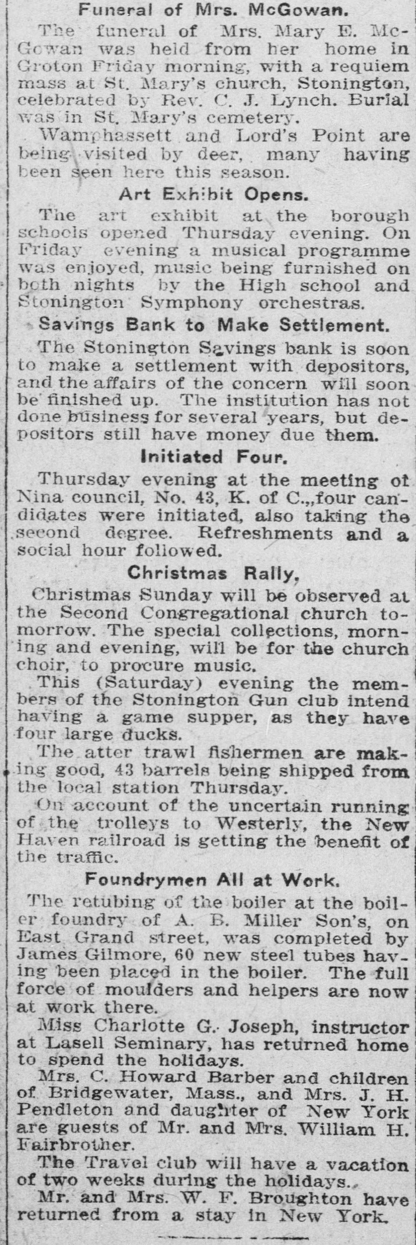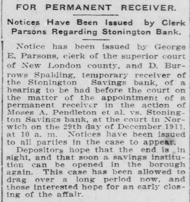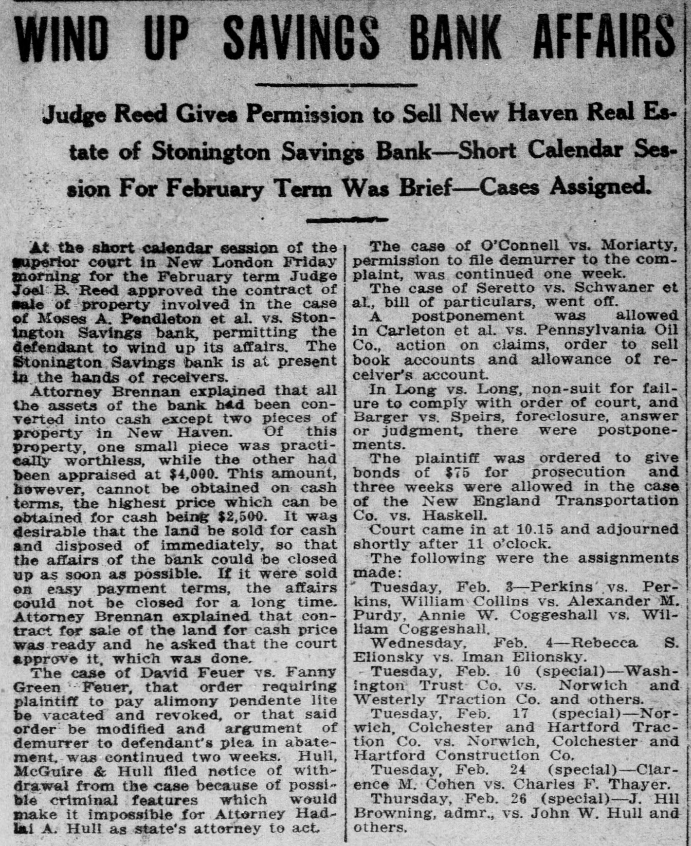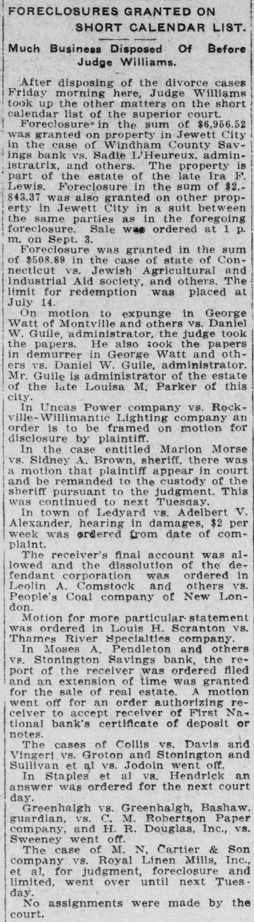 SHORT CALENDAR MATTERS IN SUPERIOR COURT. Two Motions to Set Aside Verdicts Were Argued. Of the 20 matters on the short calendar list in the superior court Friday, besides the uncontested divorces, all but five were heard, as follows: The motion of the city of New London to set aside the verdict of $2,750 recently returned by a jury in the superior court against the city and in favor of Miss Eunice H. Allen, was argued, and the judge took the papers. A like motion in the case of Wellington Allen vs. the Connecticut Co., in which the Connecticut Co. asks that the verdict of $3,000, recently awarded Allen by a jury, and the judge took the papers. It is interesting to note that in the last three cases tried the jury has found for the plaintiff, and motions to set aside have followed. In the case of Pendleton et ux. VS. Stonington Savings bank, an order for a hearing on appointment of permanent receiver was granted. In the case of Hanson et al. vs. the West Mystic Boat Co., Nathan Belcher of New London was confirmed as permanent receiver, and four months as a time limit for presenting claims was fixed. Permission to employ counsel was granted. Pleadings were filed by stipulation in the case of Walker VSA Walker. The motion for default for failure to plead was argued in Margaret Kenure vs. Brainerd & Armstrong Co., and Judge Wheeler took the papers. An allowance of $35 in ten days to defend was made in the divorce suit of Miner vs. Miner. An answer in ten days was ordered in Charlotte H. Trail vs. Mark D. Stiles. An answer in ten days was ordered in W. H. Trail VS. Mark D. Stiles. An answer in two weeks was ordered in Ida K. Billings, executrix, and others, vs. Alexander F. Shaw. Pleadings in two weeks were ordered in Rebecca Cowles vs. city of New London. In Charles II. Champlin vs. city of New London pleadings were ordered in two weeks. Judgment of non-suit was opened in the divorce suit of Ginevra R. Karoli vs. Henry P. Karoli. A special bail of $2,000 was ordered in two weeks in Angelene Leonetta ys. Joseph Marano. This to be filed before the pleadings. Cases Assigned. The following jury cases were assigned for hearing at Norwich: Tuesday-John Garlington vs. Blissville Mills Co., Inc. (now on trial); Joseph Musial and wife vs. Daniel Kudlik. Wednesday-Henry A. Rogers VS. The Soltz Co., New England Hebrew Farmers' society VS. Louis Schwarth, Emma J. Raughitan VS. Norwich Nickel and Brass Co. Thursday-Willard B. Sunderland vs. Groton and Stonington Street Railway Co., Amede Chetty vs. town of Montville, Georgianna Chetty vs. town of Montville. Dec. 26 (special)-Angello Covell, administrator, vs, Connecticut Co. PAGE 11