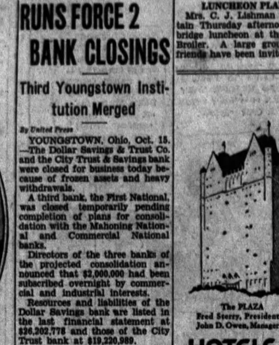 RUNS FORCE 2 BANK CLOSINGS Third Youngstown Institution Merged By United Press Ohio, Oct. 15. -The Dollar Savings & Trust Co. and the City Trust & Savings bank were closed for business today because of frozen assets and heavy withdrawals. A third bank. the First National. was closed temporarily pending completion of plans for consolidation with the Mahoning National and Commercial National banks. Directors of the three banks of the projected consolidation announced that $2,000,000 had been subscribed overnight by commercial and industrial interests. Resources and liabilities of the The PLAZA Dollar Savings bank are listed in Fred Storry. President the last financial statement at John D. Owen, Manager $26,202,778 and those of the City Trust bank at $19,220,989.