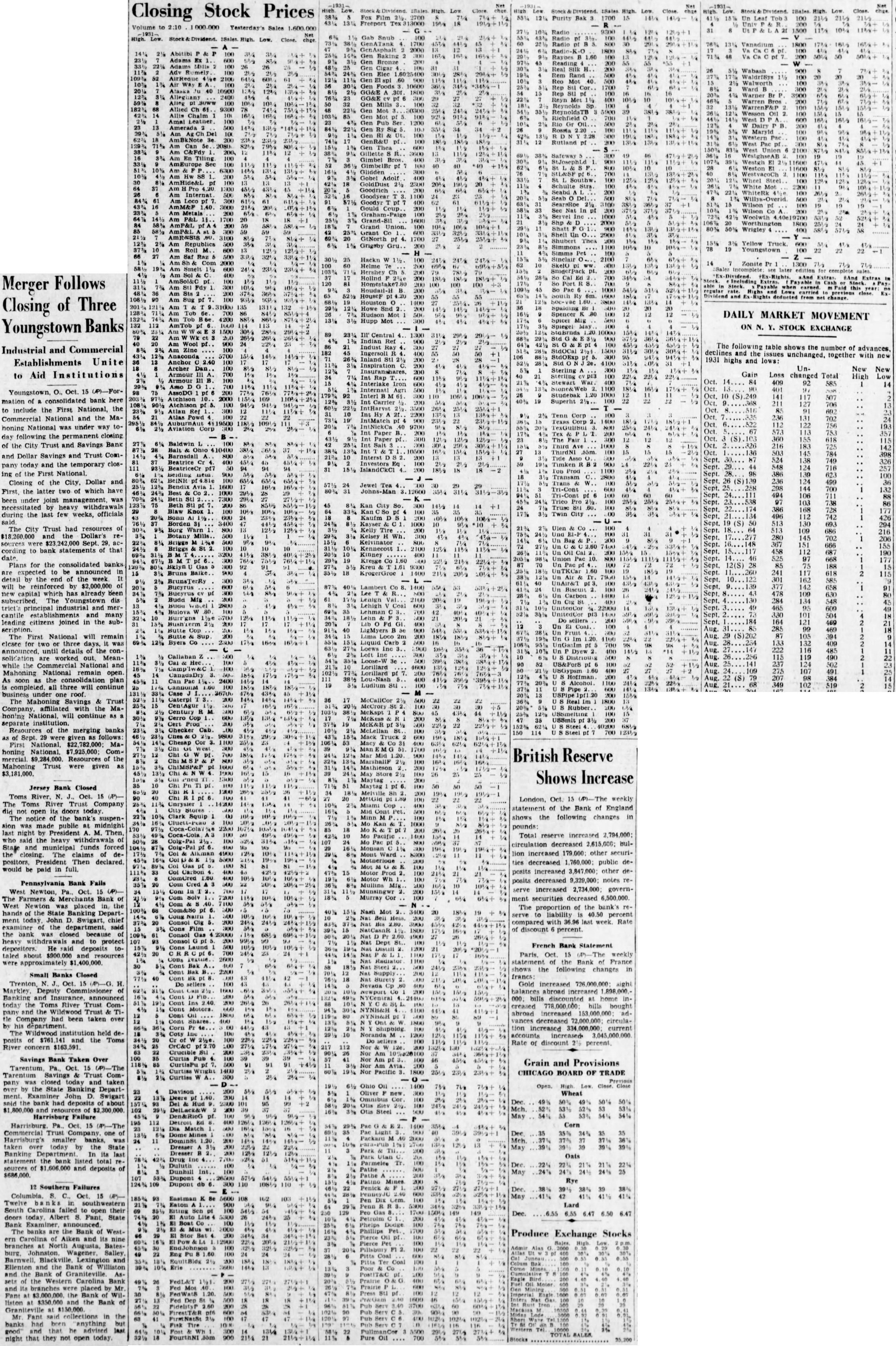 Merger Follows Closing of Three Youngstown Banks Industrial and Commercial Establishments Unite to Aid Youngstown, O., Oct. 15 (P)-Formation of a consolidated bank here to include the First National, the Commercial National and the Mahoning National was under way today following the permanent closing of the City Trust and Savings Bank and Dollar Savings and Trust Company today and the temporary closing of the First National. Closing of the City, Dollar and First, the latter two of which have been under joint management, was necessitated by heavy withdrawals during the last few weeks, officials said. The City Trust had resources of $18,260,000 and the Dollar's resources were $23,242,000 Sept. 29, according to bank statements of that Plans for the consolidated banks are expected to be announced in detail by the end of the week It will be reinforced by $2,000,000 of new capital which has already been subscribed. The Youngstown dis trict's principal and mercantile establishments and many leading citizens joined in the subThe First National will remain closee for two or three days. it was announced. until details of the consolidation worked out. Meanwhile the Commercial National and Mahoning National remain open. As soon as the consolidation plan is completed. all three will continue business under one roof. The Mahoning Savings & Trust Company. affiliated with the Mahoning National. will continue as a separate institution. Resources of the merging banks as of Sept. 29 were given follows: First National. $22,782,000: Mahoning National $7,925,000; Commercial. $9,284,000. Resources of the Mahoning Trust were given as $3,181,000. Jersey Bank Closed Toms River. N. J., Oct. 15 (AP)The Toms River Trust Company did not open its doors today. The notice of the bank's suspension was made public at midnight last night by President A. M. Then who said the heavy withdrawals of State and municipal funds forced the closing. The claims of depositors, President Then declared. would be paid in full. Pennsylvania Bank Fails West Newton, Pa., Oct. 15 (P)The Farmers & Merchants Bank of West Newton was placed in, the hands of the State Banking Department today. John D. Swigart, chief examiner of the department, said the bank was closed because of heavy withdrawa and to protect depositors. He said deposits totaled about $900,000 and were approximately $1,400,000. Small Banks Closed Trenton, N. J., Oct. 15 (P)-G. H. Markley. Deputy Commissioner of Banking and Insurance. announced today the Toms River Trust Company and the Wildwood Trust & Title Company had been taken over by his The Wildwood institution held deposits of $761,141 and the Toms River concern $163,591. Savings Bank Taken Over Tarentum Savings Trust Company was closed today and taken over by the State Banking Department. Examiner John D. Swigart seid the bank had deposits of about $1,800,000 and of $2,300,000. Harrisburg Failure Commercial Trust Company, one of Harrisburg's banks, was taken over today by the State Banking In its last statement the bank listed total resources of $1,606,000 and deposits of $686,000. 12 Southern Failures Columbia. S. C., Oct. 15 (A)Twelve in southwestern South Carolina failed to open their doors today. Albert S. Fant, State Bank Examiner, announced. The banks are the Bank of Western Carolina of Aiken and its nine branches North Augusta, BatesBarnwell, Blackville Lexington and Ellenton and the Bank of Williston and the Bank of Graniteville Assets of the Western Carolina Bank and its branches were placed by Mr Fant at $3,000,000. the Bank of Williston at $350.000 and the Bank of Graniteville at $150,000. Mr. Fant said collections in the banks had been anything but good' and that he advised last night that they not open today. Closing Stock Prices High High. Low High High. High. Close. 38% Fox Film Purity 1700 Un Freeport Tex 313000 Volume to 2:10 000.000 Yesterday's Sales Radio 9300 Gab Snub Low. High. Low. Close. Radio GenAsphalt Abitibi Baking Raybes 1.60 71% Adams Ex 600 Bronze Reading 22% Adams 100 Cigar Real 26 Wabash Rumely Elec Rem Rand 109% 2100 spl 60 Mot Walworth 10% Foods 10600 Ward Alaska 40 10900 GG&E 1800 Warner 2400 GG&E Reyn Met Warren Alleg Mills Reynolds WarrenF&P Allied Ch 9300 Mot ReynoldsTB 3814 Wesson Oil Allis Chalm 103% Mot Richfield West Amal Leather. 1200 Dairy Amerada 29% Western Pac AmBkNote GenR&U Rutland West Pac West Union C&Fdy Gillette Safeway WestghseAB Tiling Gimbel 30% Westgh AmEurope GimbelBr Weston E1 Glidden WestvacoCh Gobel Adolf Southw. Wheel AmHide&L GoldDust Schulte White Goodrich Seabd A WhiteRk Internat Goodyear Goodyr 2½ Wilson AmM&F Gould Nat In Wilson Co Servel Inc Woolwth Grand-Sil Worthington 24 AmP&L Grand Shatt 80% 50% Wrigley Grant Shell Un GtNorth Shubert Thea Am Republics 3% Yellow Truck. 600 6% 1% Grigsby Gru. Simmons 78 19 Youngstown 100 22 22 22 Simms Pet Saf Hackn Sinclair 1% 14 Zonite Pr 1300 Helme SkelO Smelt Sales later edition Hershey Hollnd Dividend. Ex-Rights. And Extras. And Extras AmSol&C Homestake7.80 able Stock. Including Payable Cash Stock Paid year Houdail-H rate. Lows close. South Dividend and Ex Rights deducted carried from net change. HouseF Houston Howe Snd Spaiding Hudson Spencer DAILY MARKET MOVEMENT 13½ 3½ Hupp Mot Spicer 132 112 Spiegel 1/2 ON N. Y. STOCK EXCHANGE 80% 10000 89 Central 1300 1/2 79 Std Indian Ref Wool Indust 1/2 The following table shows the number of advances, 8% 2% StdOCal Ingersoll 50 12% Anaconda StdOExp declines 1931 and the issues unchanged. together with new Inland Stl highs 36 2.40 and lows: Anchor Inspiration Archer Un- New New Sterling Armour Gain Loss changed Total Sterling High 2% Armour Oct. 21% Stewart 84 409 92 585 Interlake 14 29% Asso Stone&Web 98 AssoDG Studebak Oct. 10 203% Atchison Carrier 40% Superht Atchison IntHarvst 23% Oct. 9½ 2% Tenn Corp Powd IntMatch Texas Corp AuburnAut IntNickCa 193 Aviation Paper Tex Paper 27% Baldwin Third Balt 410400 10500 ThirdN1 Barnsdall 398 Interst 81 Beatrice 326 Investors Eq