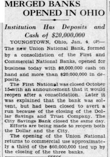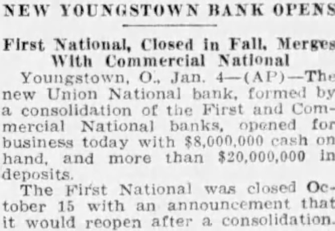 The First National was closed temporarily pending completion of plans for consolidation with the Mahoning National and Commercial National banks.