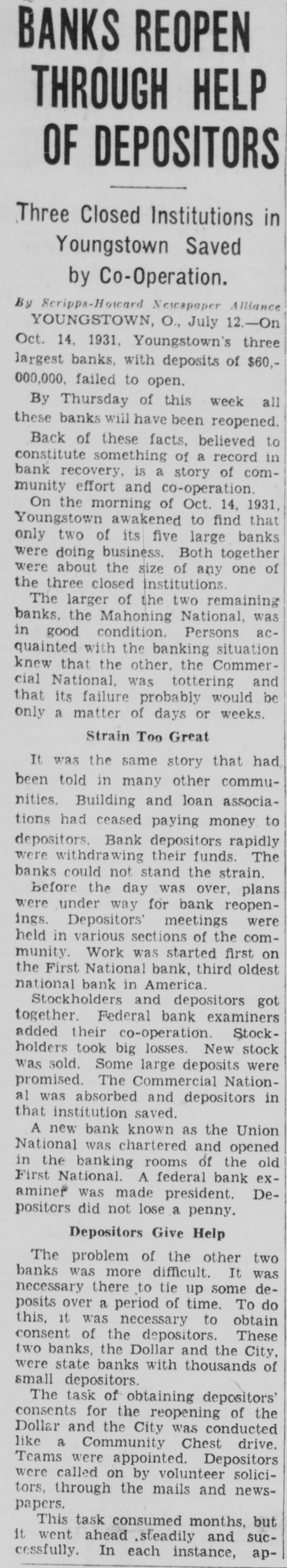 BANKS REOPEN THROUGH HELP OF DEPOSITORS Three Closed Institutions in Youngstown Saved by Co-Operation. By Scripps-Howard Newspaper Alliance YOUNGSTOWN, O., July 12.-On Oct. 14, 1931, Youngstown's three largest banks, with deposits of $60,000,000, failed to open. By Thursday of this week all these banks will have been reopened. Back of these facts, believed to constitute something of a record in bank recovery, is a story of community effort and co-operation. On the morning of Oct. 14, 1931, Youngstown awakened to find that only two of its five large banks were doing business. Both together were about the size of any one of the three closed institutions. The larger of the two remaining banks, the Mahoning National, was in good condition. Persons acquainted with the banking situation knew that the other, the Commercial National, was tottering and that its failure probably would be only a matter of days or weeks. Strain Too Great It was the same story that had been told in many other communities. Building and loan associations had ceased paying money to depositors. Bank depositors rapidly were withdrawing their funds. The banks could not stand the strain. before the day was over, plans were under way for bank reopenings. Depositors' meetings were held in various sections of the community. Work was started first on the First National bank, third oldest national bank in America. Stockholders and depositors got together. Federal bank examiners added their co-operation. Stockholders took big losses. New stock was sold. Some large deposits were promised. The Commercial National was absorbed and depositors in that institution saved. A new bank known as the Union National was chartered and opened in the banking rooms of the old First National. A federal bank examiner was made president. Depositors did not lose a penny. Depositors Give Help The problem of the other two banks was more difficult. It was necessary there to tie up some deposits over a period of time. To do this, it was necessary to obtain consent of the depositors. These two banks, the Dollar and the City, were state banks with thousands of small depositors. The task of obtaining depositors' consents for the reopening of the Dollar and the City was conducted like a Community Chest drive. Teams were appointed. Depositors were called on by volunteer solicitors, through the mails and newspapers. This task consumed months, but it went ahead steadily and successfully. In each instance, ap-